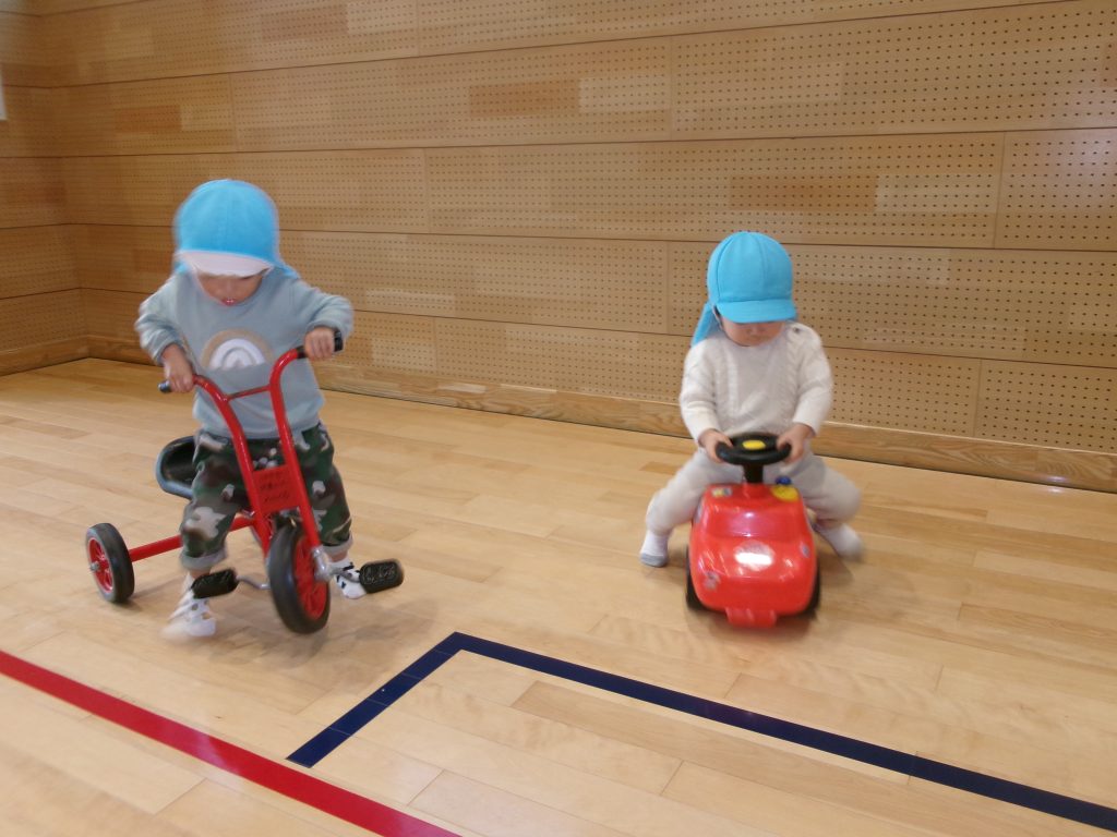 そのあとは、体育館で一休憩です。水分補給もバッチリになると、いざ遊び始め! 園とは違う玩具や乗り物に興味津々です☆