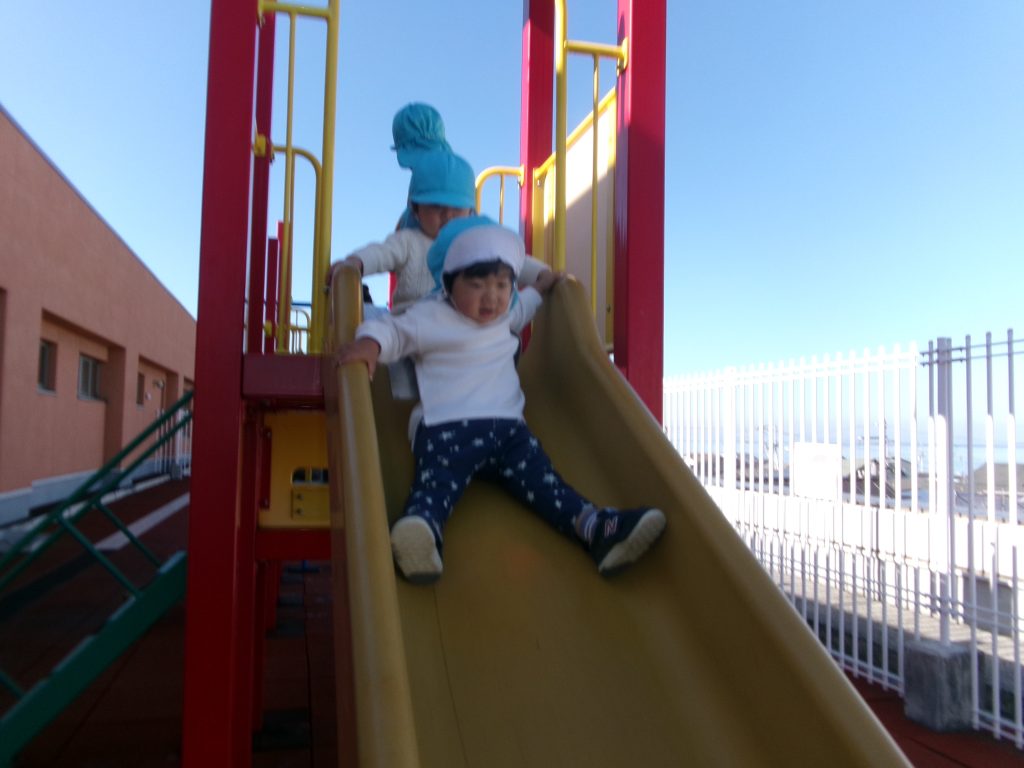 先生と手を繋ぎながら網の上を渡ったり、長い滑り台を滑ったりしました。