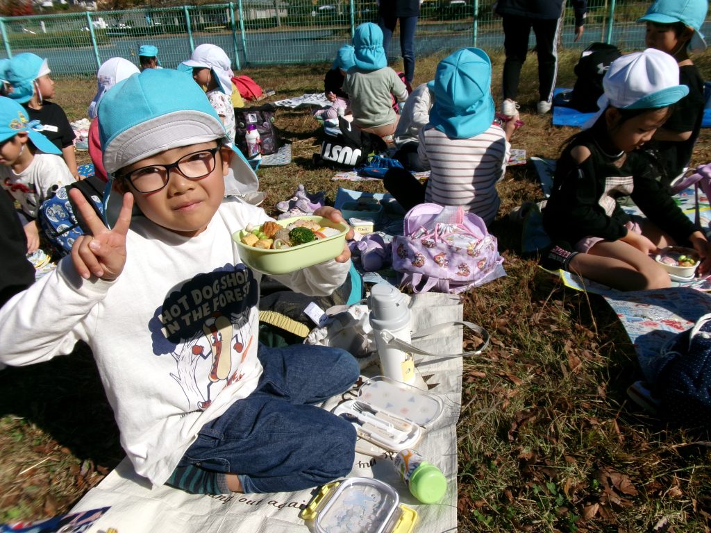「ウインナーがたくさん入ってた(^^)」「デザートのりんごもあるよ」とまたまたうれしそうに伝えてくれていました。そしてお菓子もパクパク(^^)外で食べるの楽しいね!