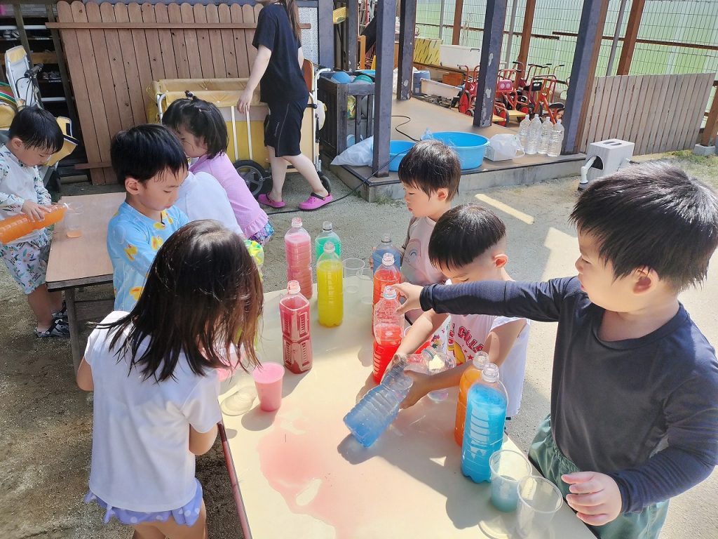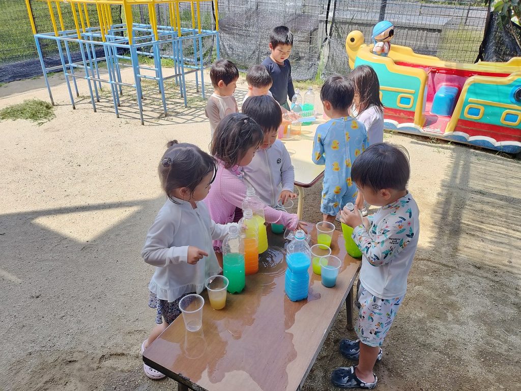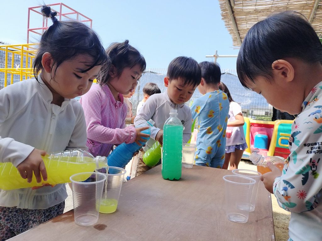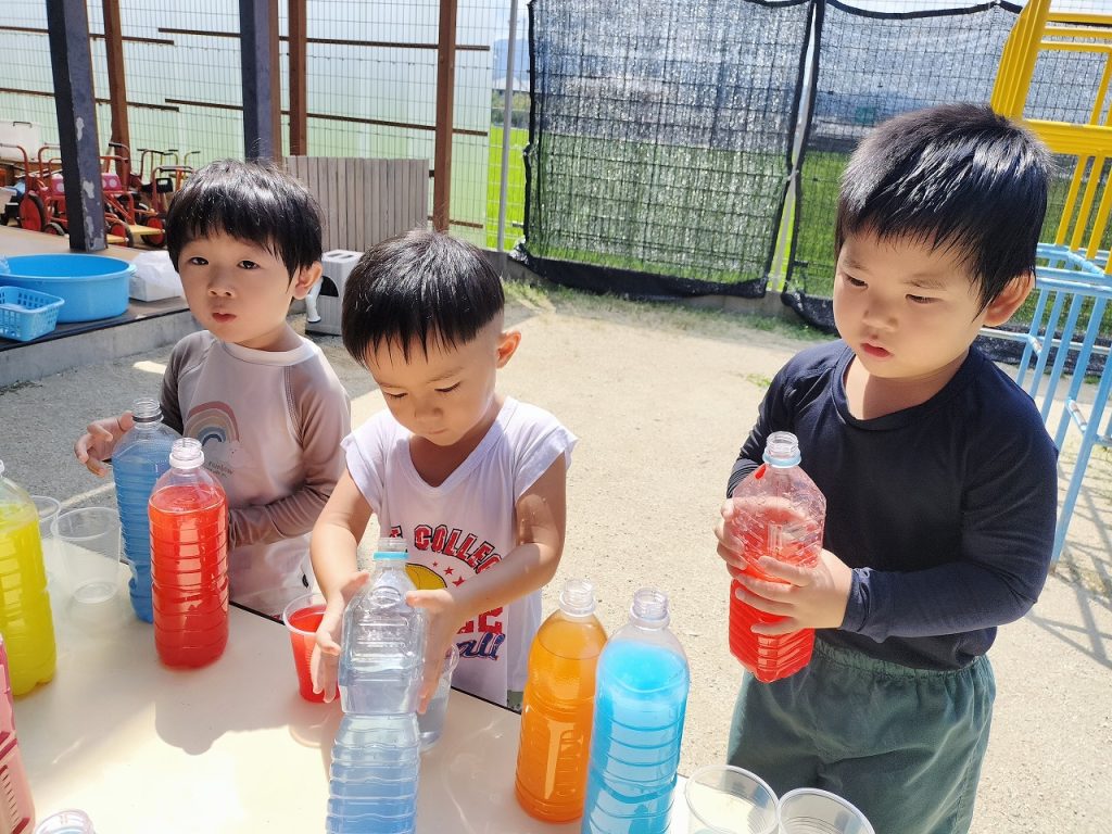 色水遊びもしました(^^)v 色を選びながらコップの中に注いでいき、いろんな色ができました。色が混ざりすぎて最後には茶色になったりもしながら、担任が「ぶどうジュースみたい」「コーヒーみたいだね」と声をかけると、子どもたちのやる気がアップ!ジュース屋さんになって、どんどん作って楽しんでいました。いろんなジュースができた中からお気に入りのジュースを1つ選んで、みんなで写真を撮りました!