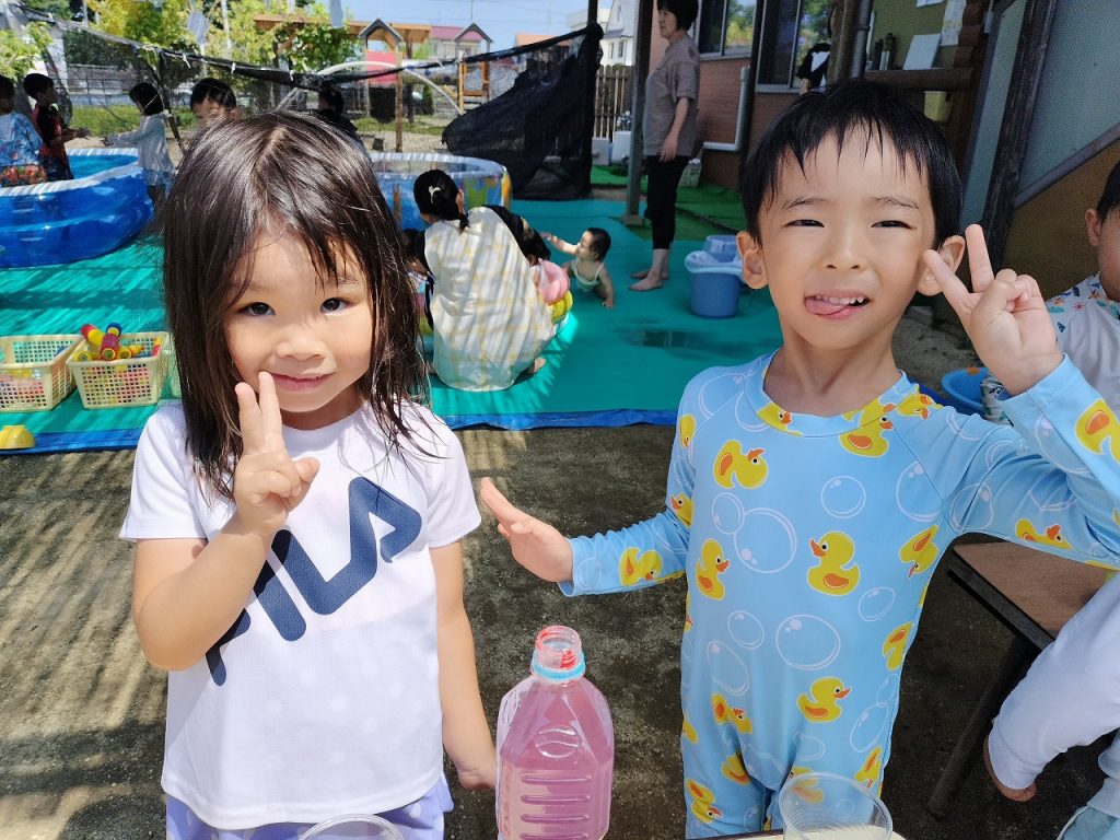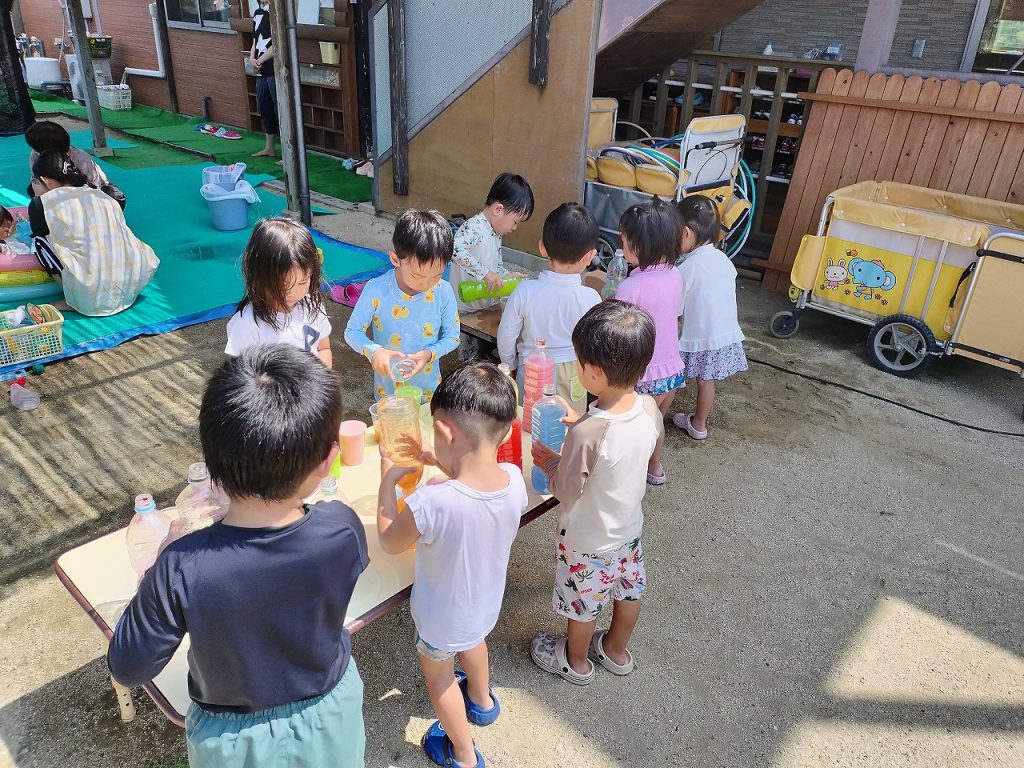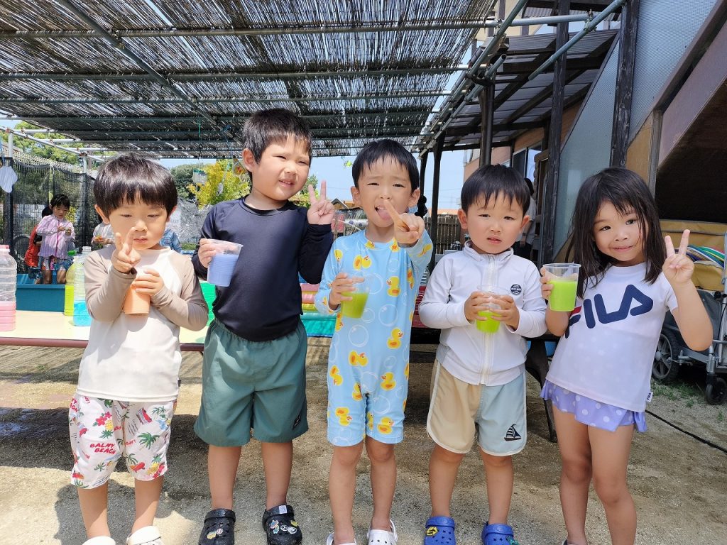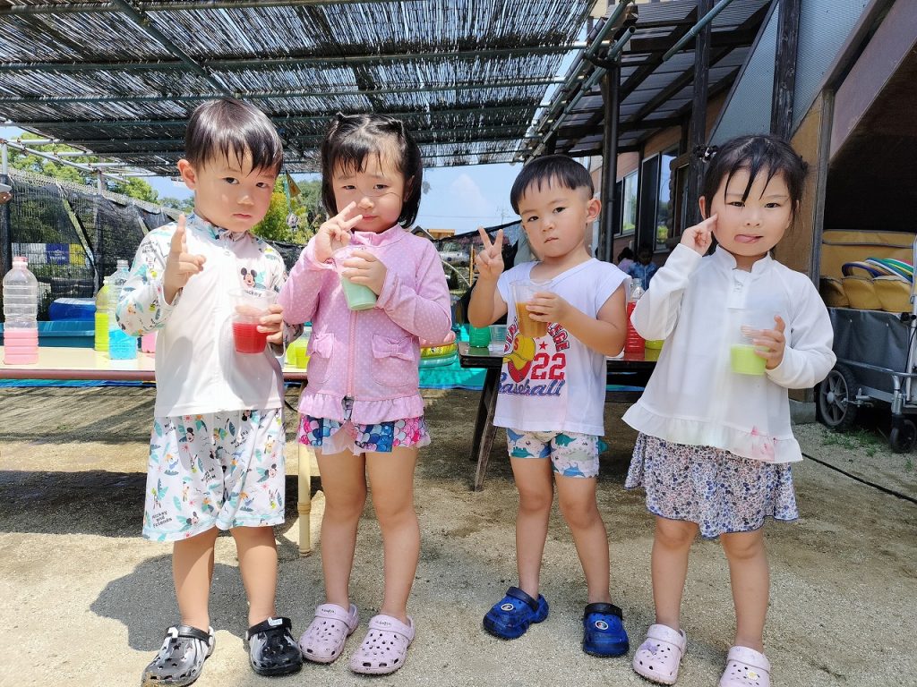 色水遊びもしました(^^)v 色を選びながらコップの中に注いでいき、いろんな色ができました。色が混ざりすぎて最後には茶色になったりもしながら、担任が「ぶどうジュースみたい」「コーヒーみたいだね」と声をかけると、子どもたちのやる気がアップ!ジュース屋さんになって、どんどん作って楽しんでいました。いろんなジュースができた中からお気に入りのジュースを1つ選んで、みんなで写真を撮りました!