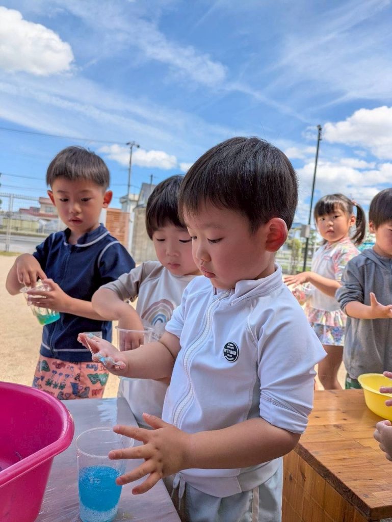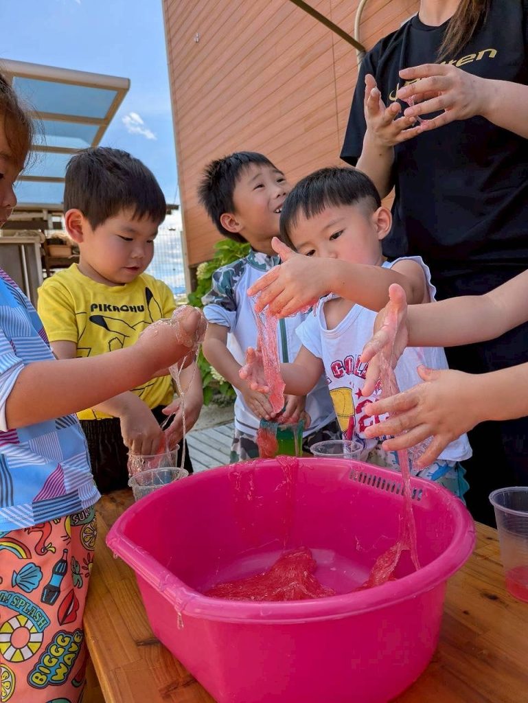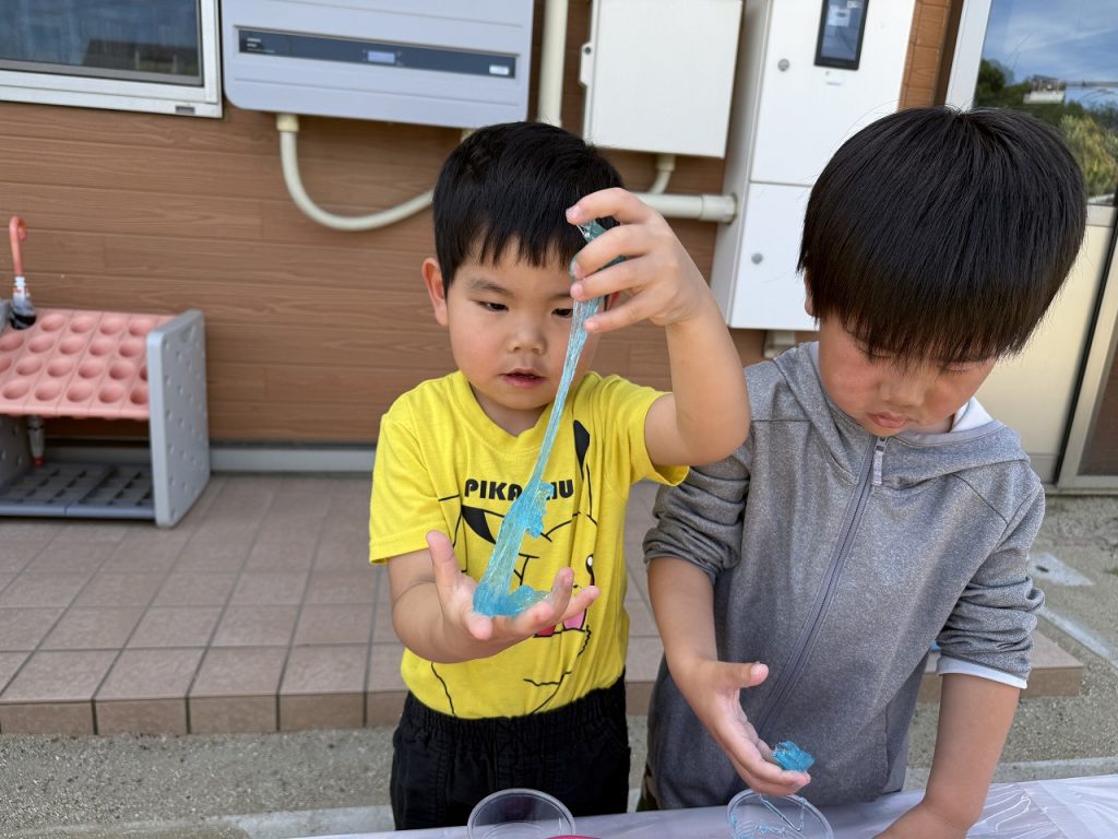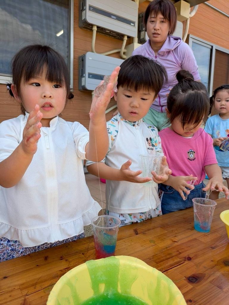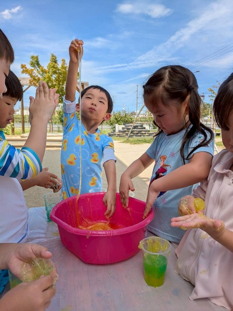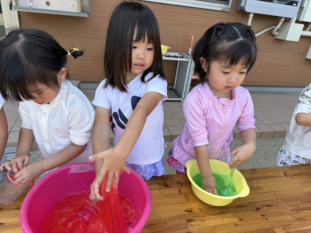 園庭の日陰の場所で、スライムをしました。触れるとのび~るのびる。初めは手についたスライムが気になっていましたが、どんどん伸びるスライムに面白さを感じ始め、どのぐらい伸びるか挑戦したり、容器に入れてゼリーを作ったりして楽しんでいました。
