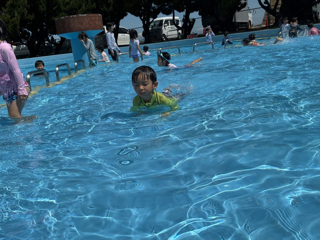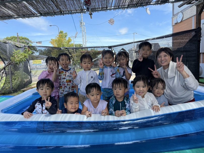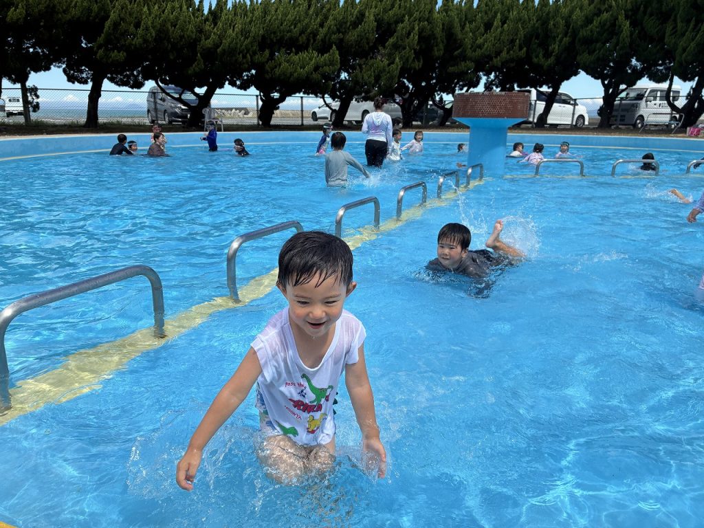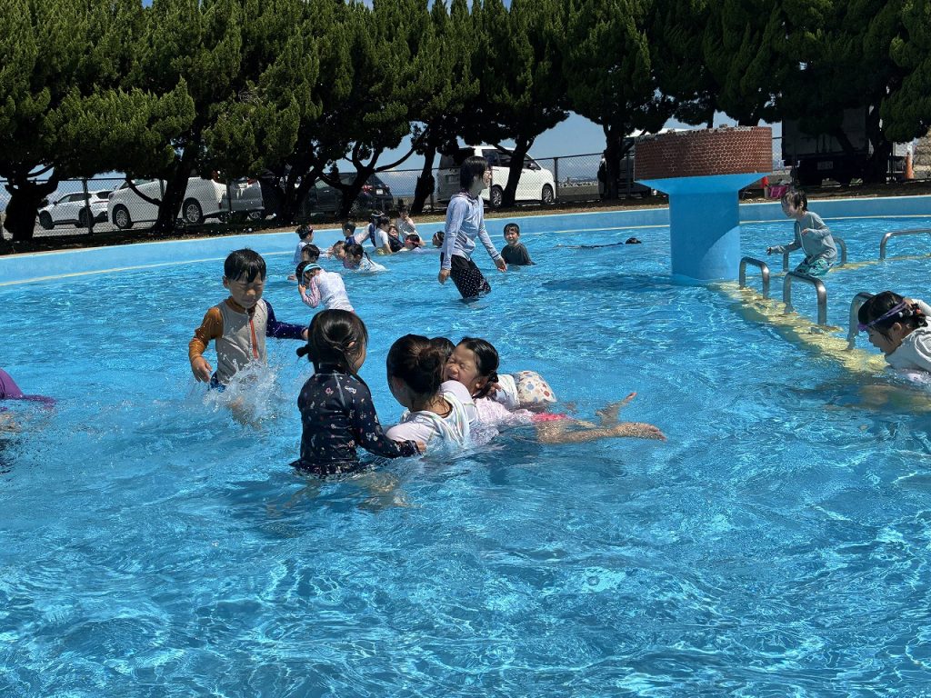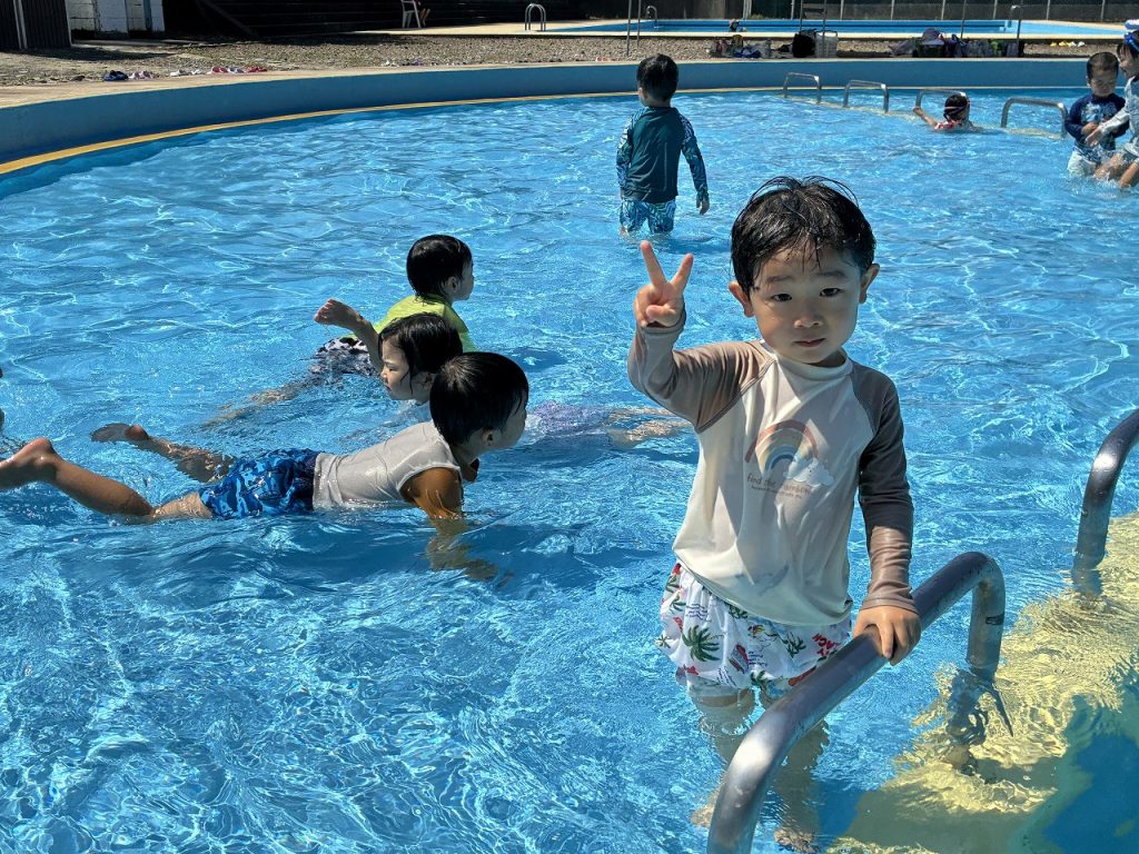そら組さんは初めての五色浜プールで、朝からハイテンション!五色浜プールは塩水を溜めているので、いつもの園のプールとは、 味も?! 広さも、肌触りも、開放感も違います(^-^)みんな大喜びで遊びました。