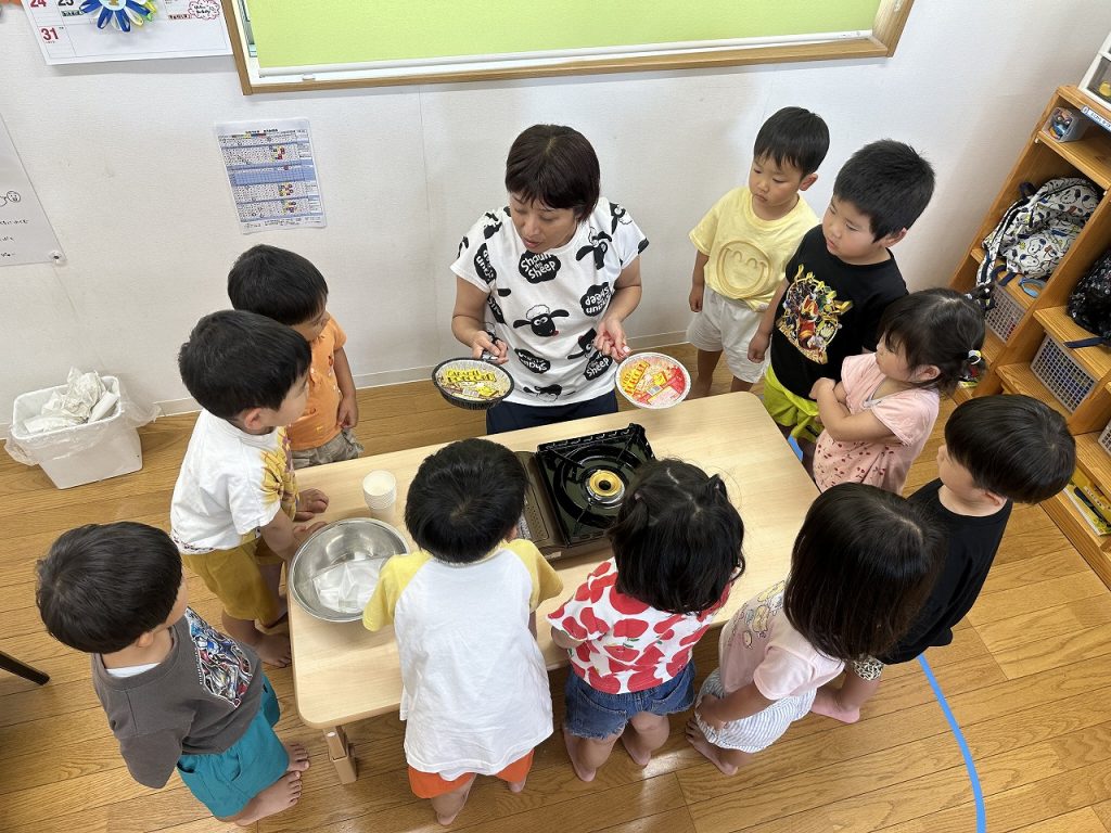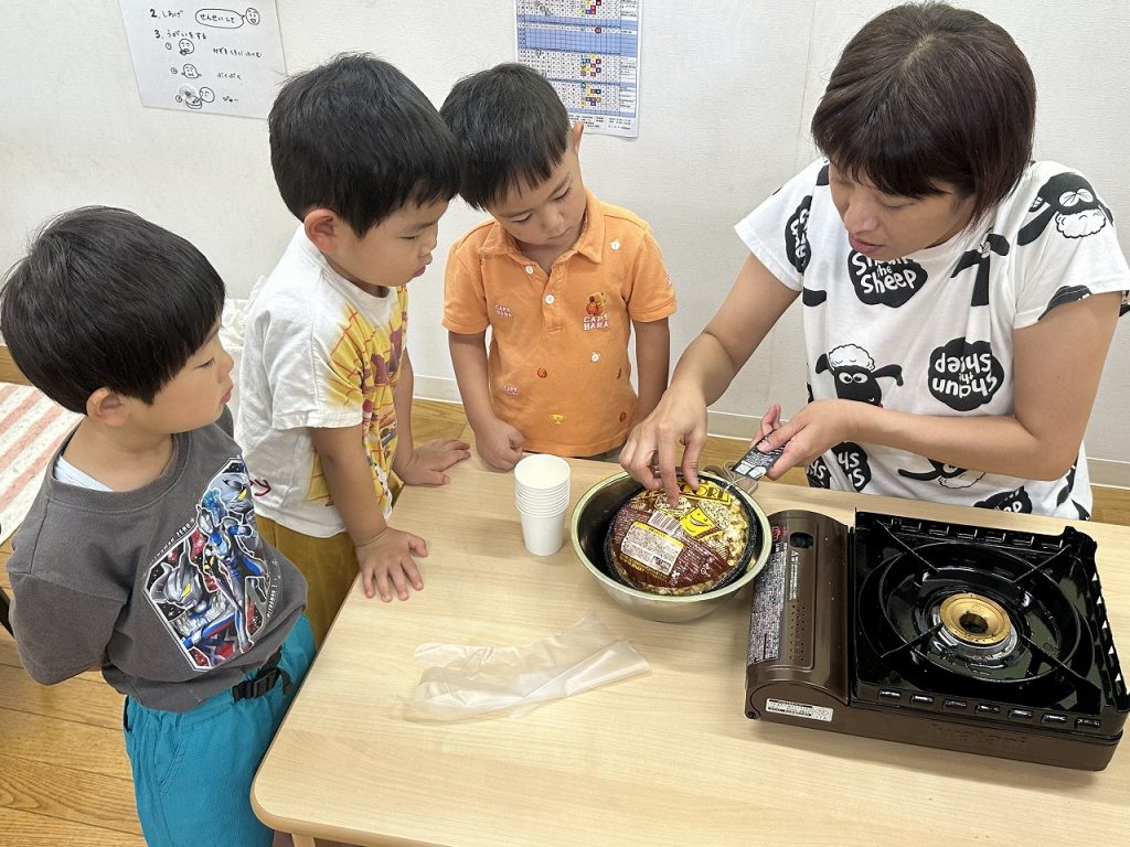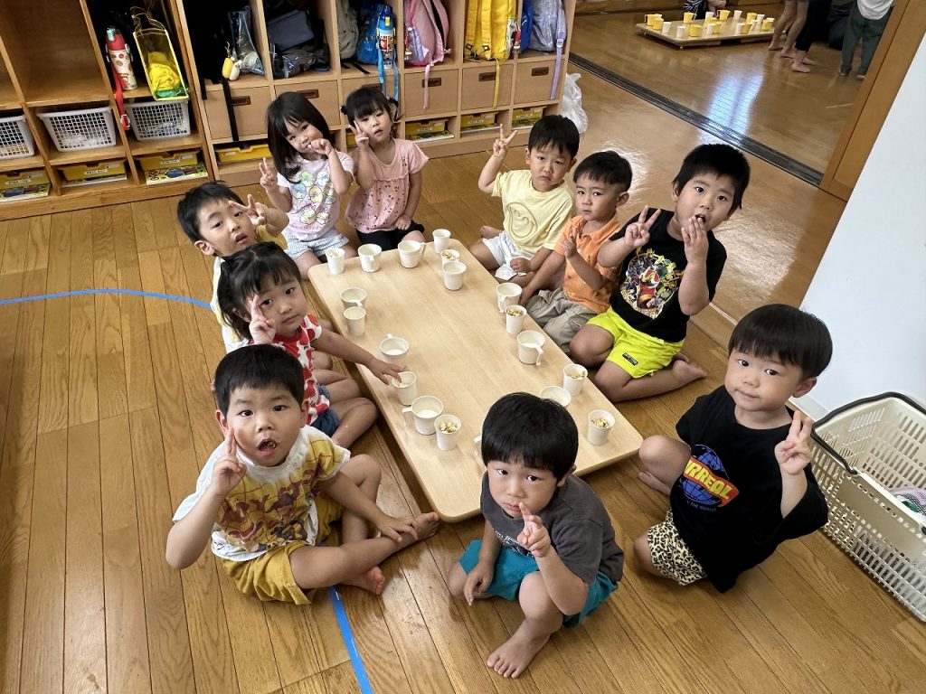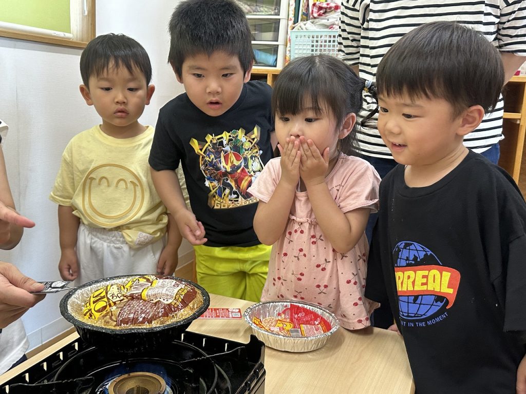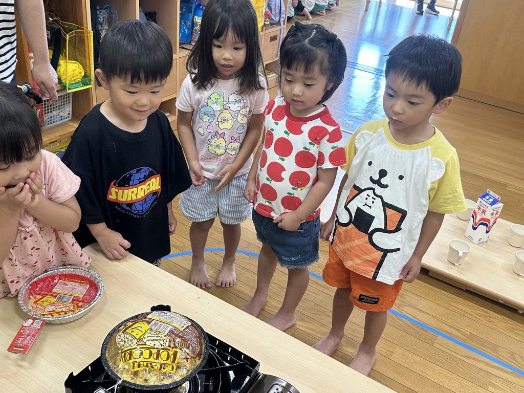 ある日の午後のおやつがポップコーン。コーンがはじける音や香りにワクワクしながら、担任が作る様子に興味津々。みんな、ポップコーンにくぎ付けです。担任は焦がさないように振って振って振り続け、おいしいポップコーンができました(^^)そして、できたてポップコーンを、みんな夢中で食べました!