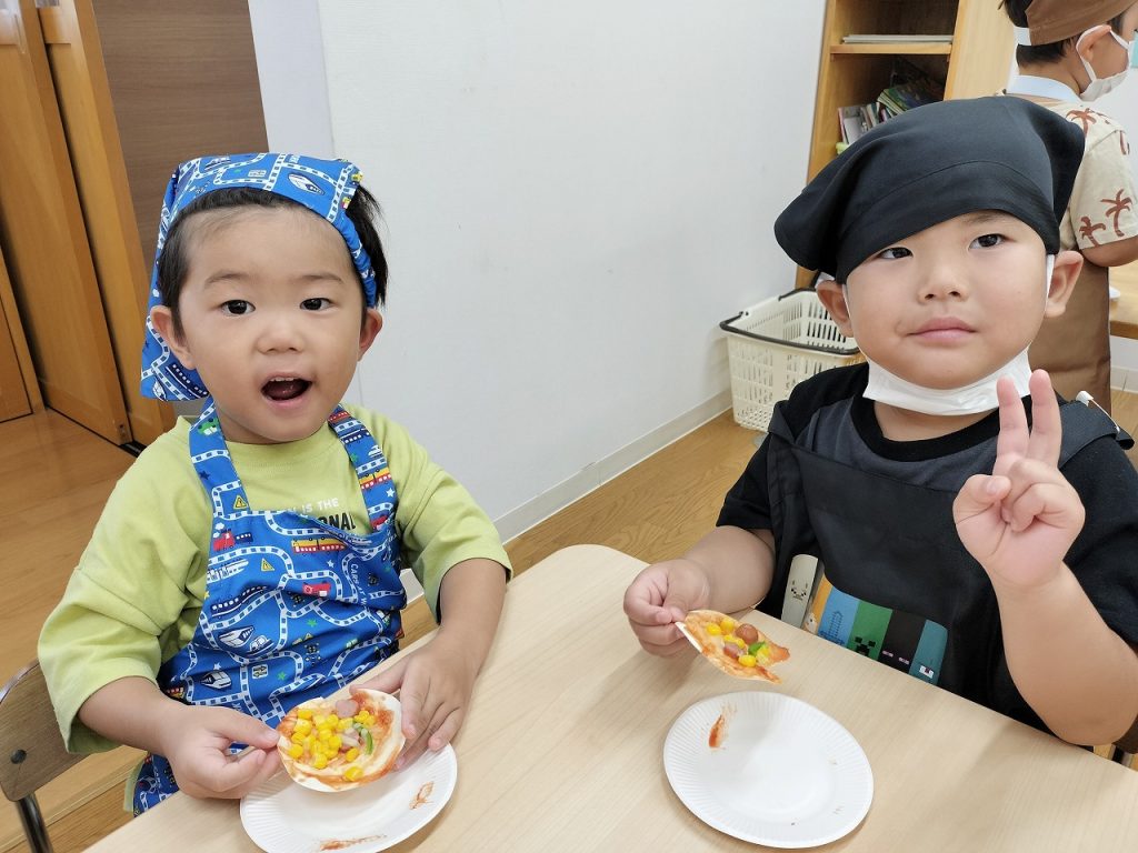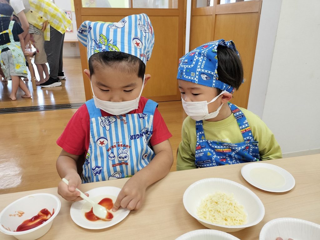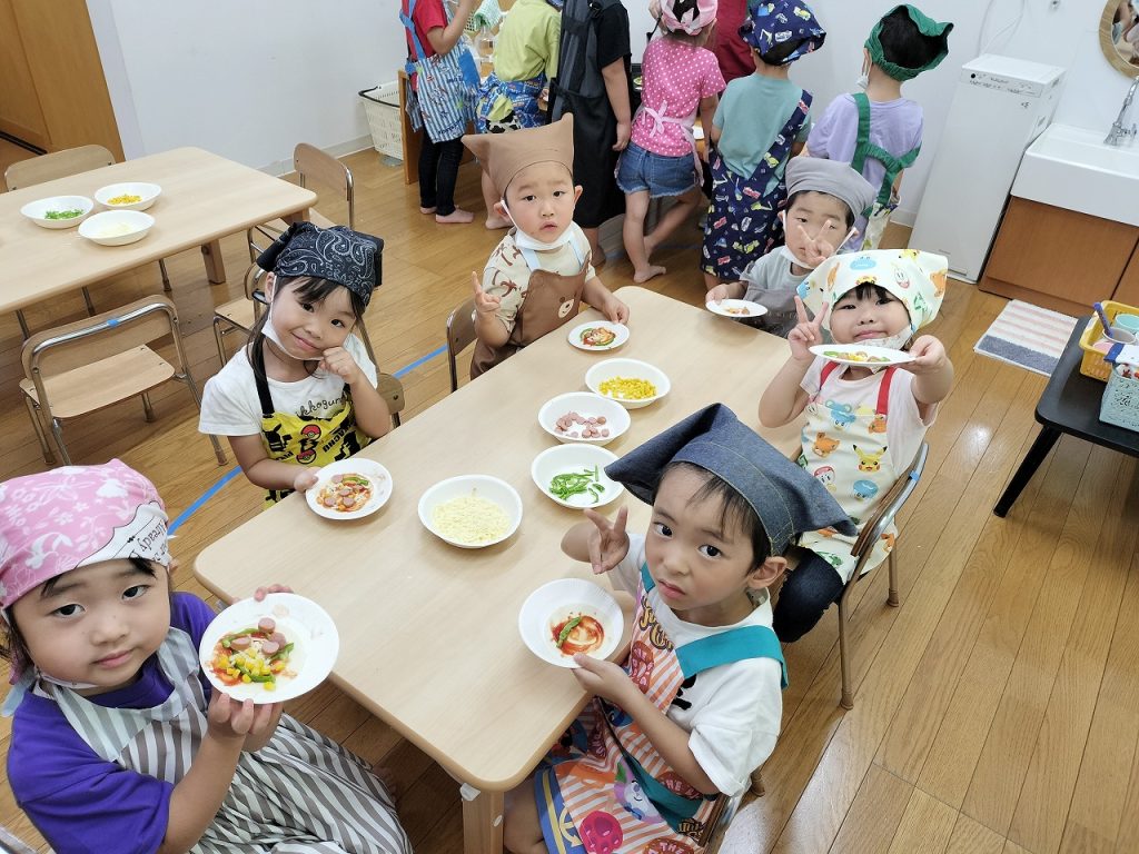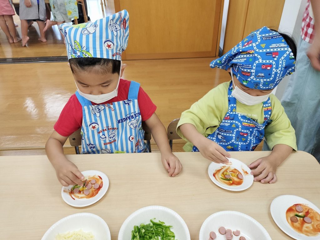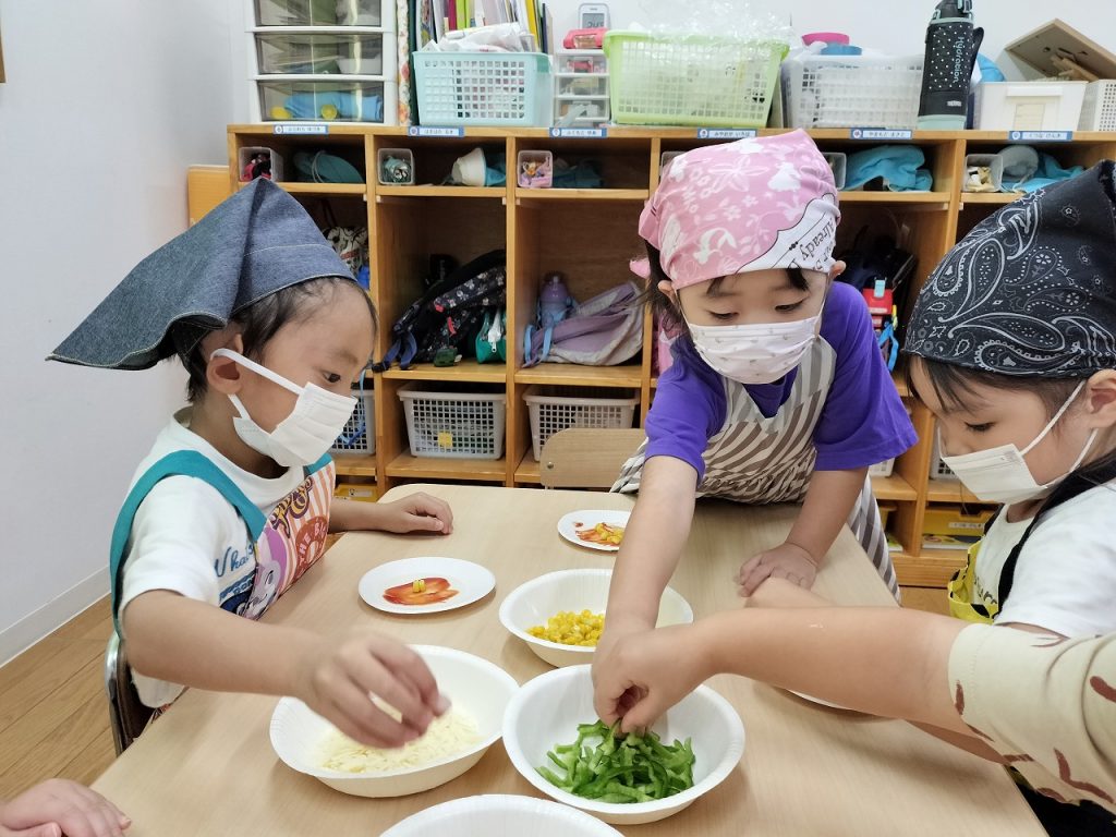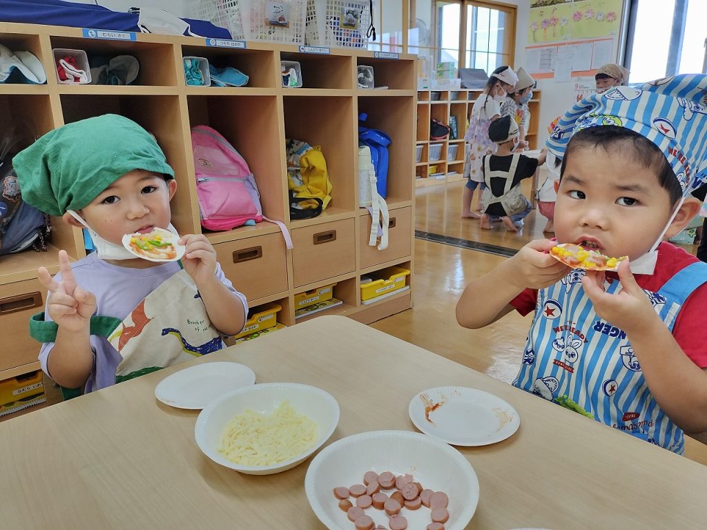 今回のピザ作りを通して、作る楽しさや自分で作ったものを食べる喜び、友達との共有…いろいろなことを感じる体験ができたと思います。また次回、子どもたちが喜ぶクッキングの計画をして、みんなで楽しみたいと思います。 エプロン・三角巾の準備をしていただき、ありがとうございました。