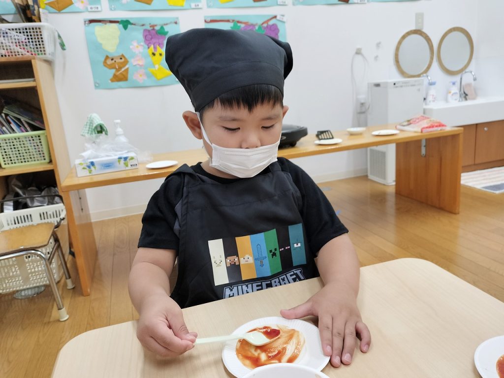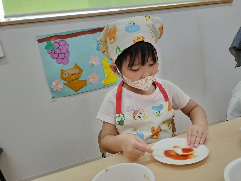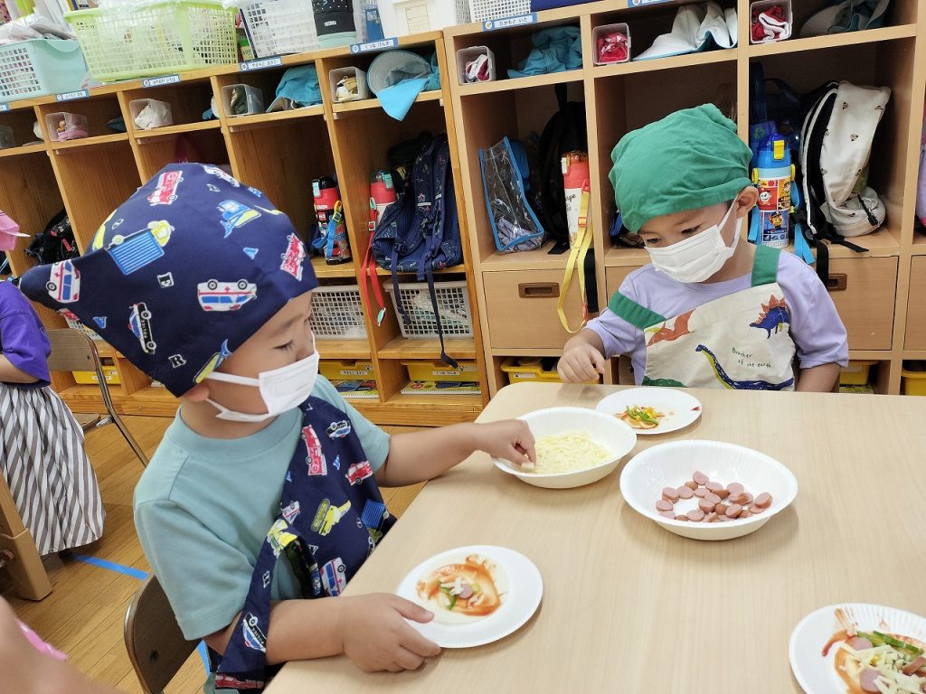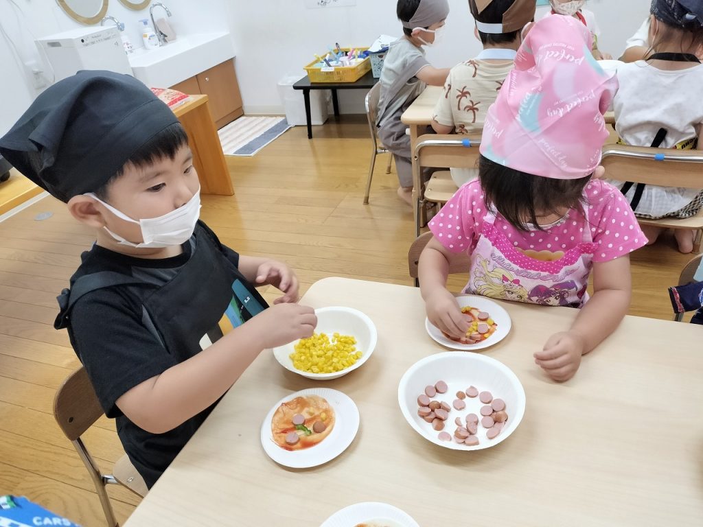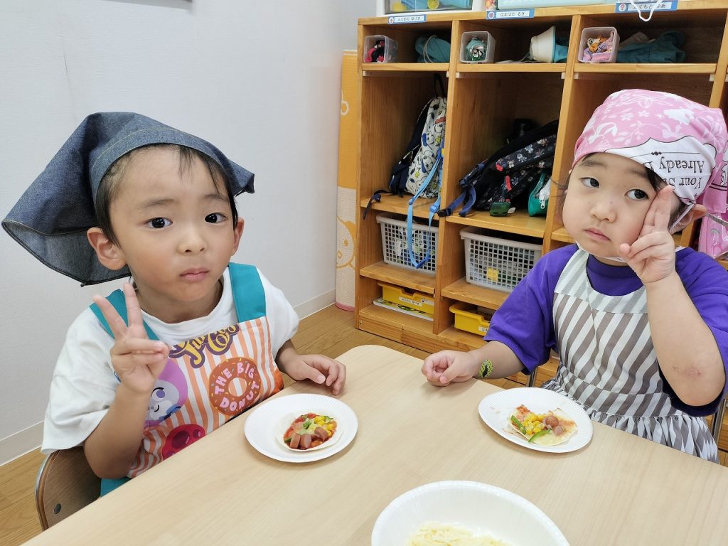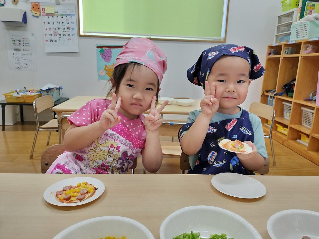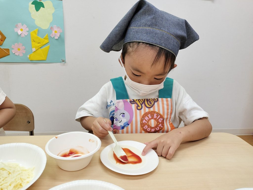 今回のピザ作りを通して、作る楽しさや自分で作ったものを食べる喜び、友達との共有…いろいろなことを感じる体験ができたと思います。また次回、子どもたちが喜ぶクッキングの計画をして、みんなで楽しみたいと思います。 エプロン・三角巾の準備をしていただき、ありがとうございました。
