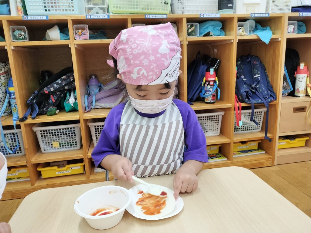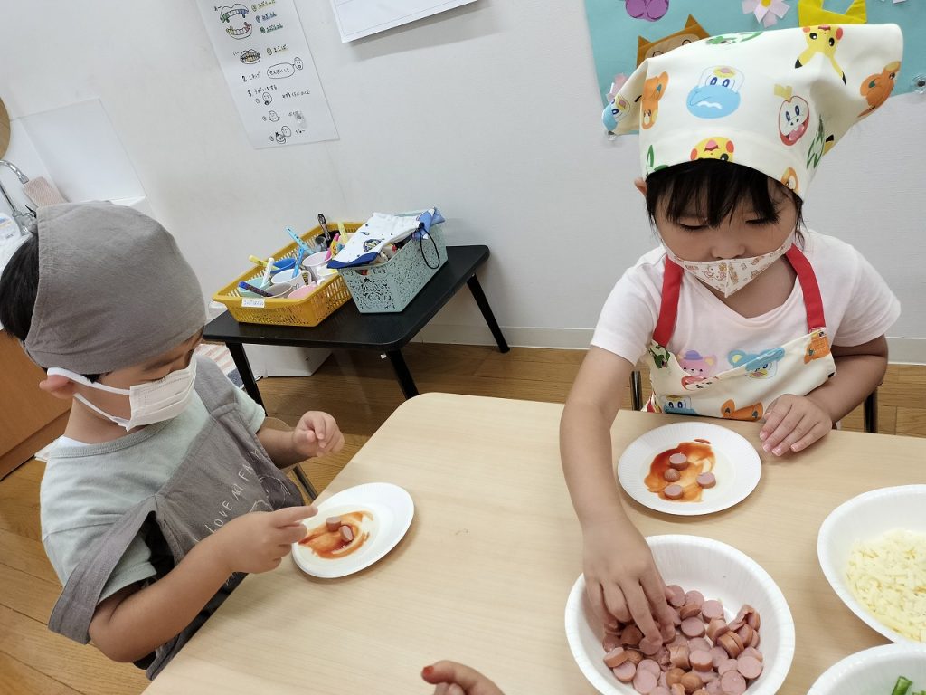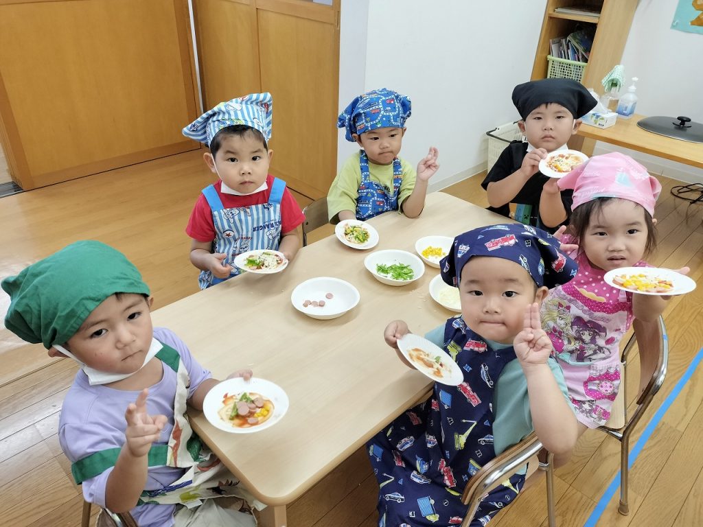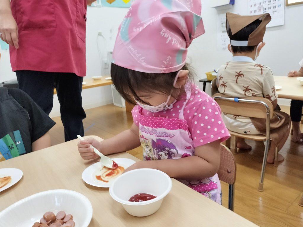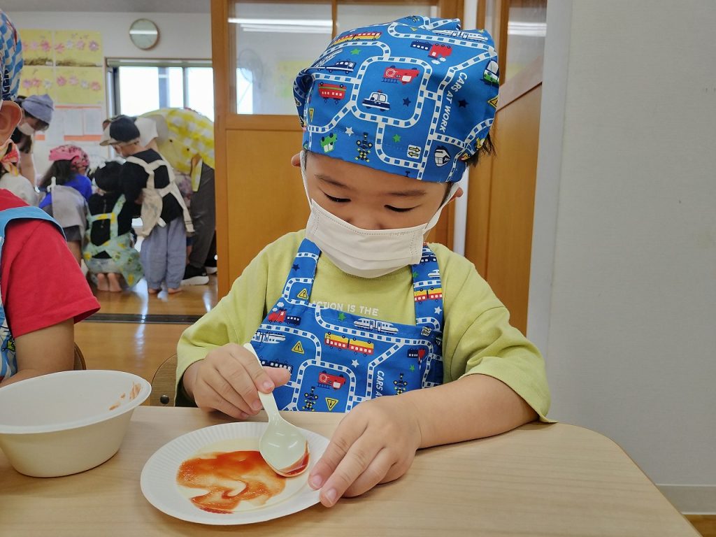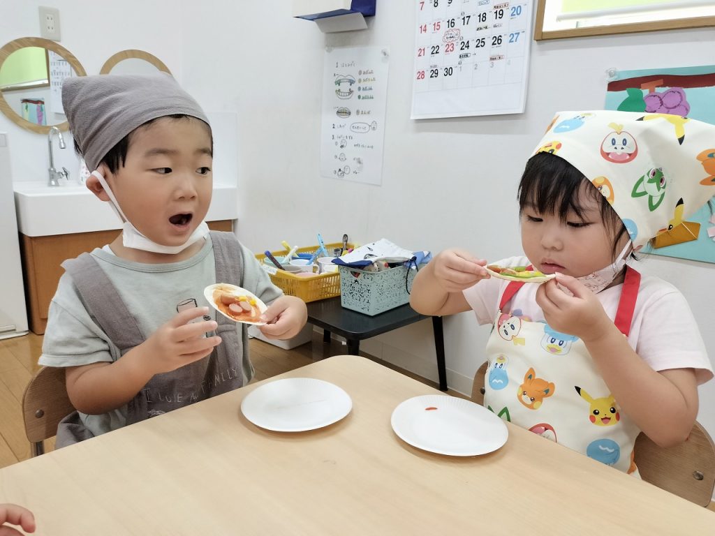 今回のピザ作りを通して、作る楽しさや自分で作ったものを食べる喜び、友達との共有…いろいろなことを感じる体験ができたと思います。また次回、子どもたちが喜ぶクッキングの計画をして、みんなで楽しみたいと思います。 エプロン・三角巾の準備をしていただき、ありがとうございました。