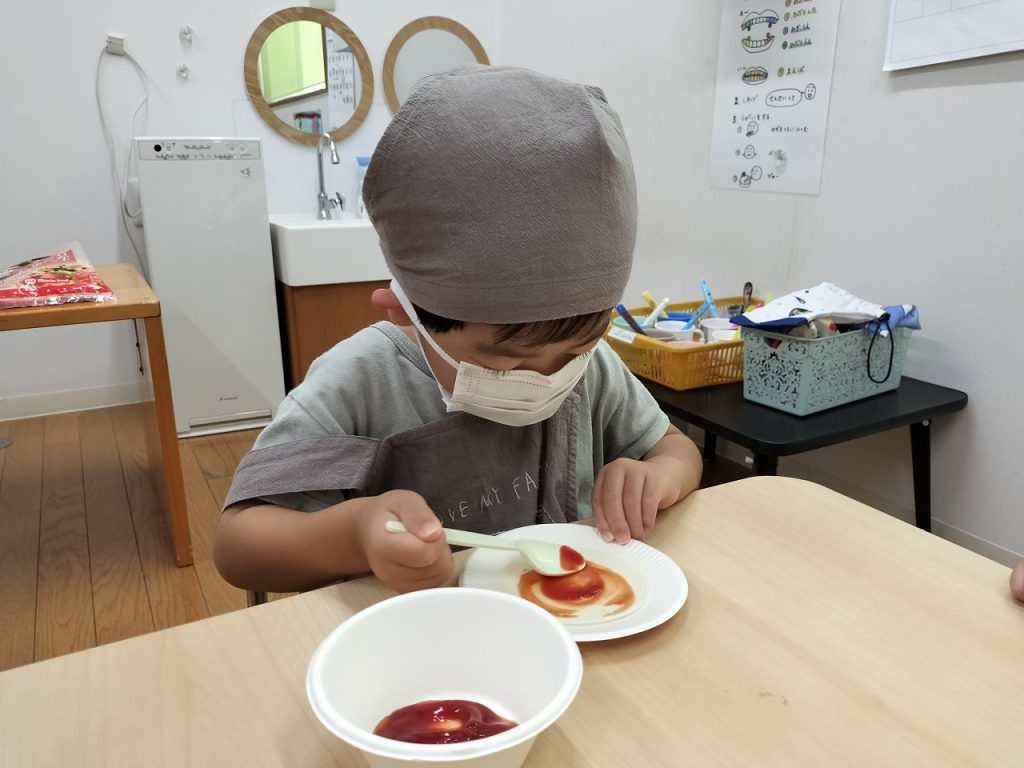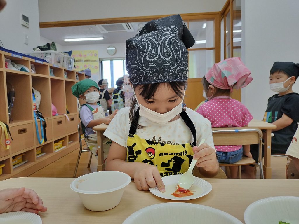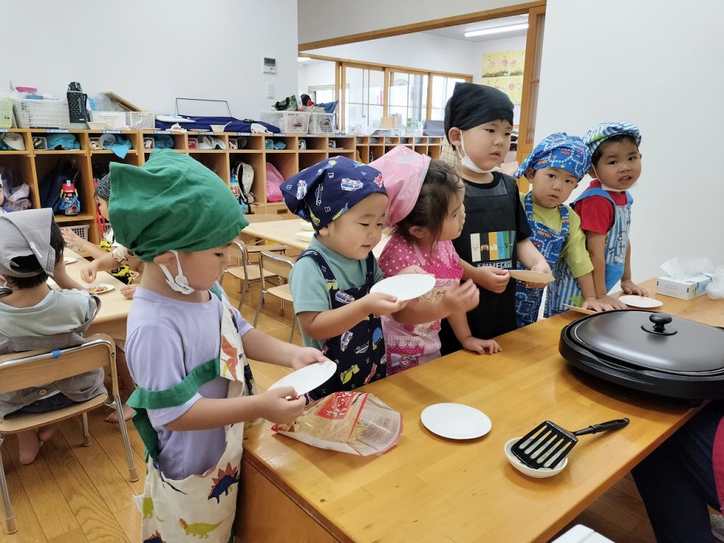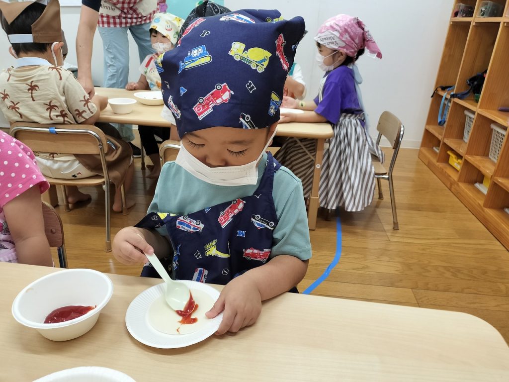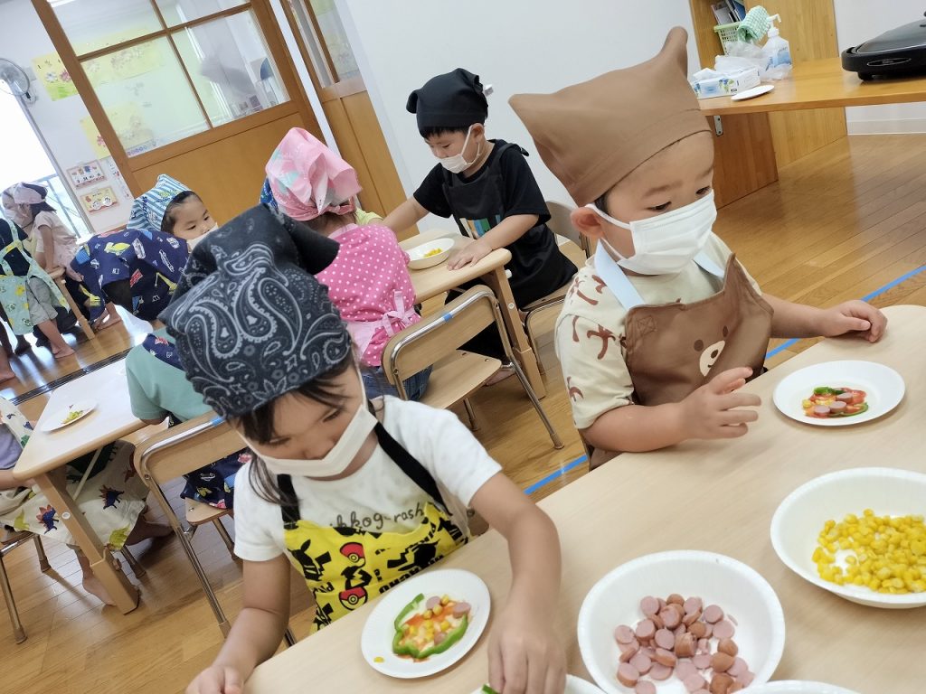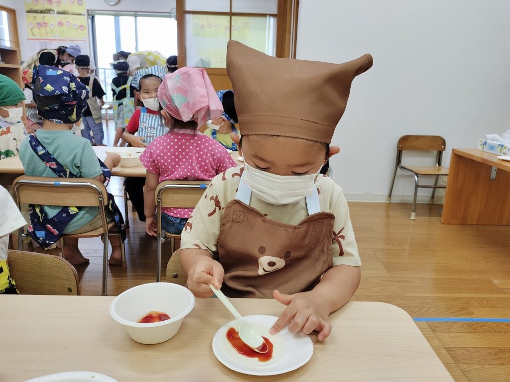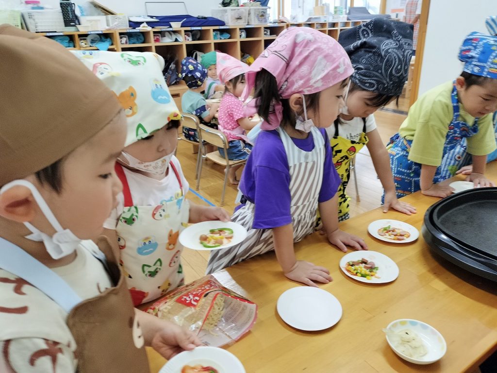 今回のピザ作りを通して、作る楽しさや自分で作ったものを食べる喜び、友達との共有…いろいろなことを感じる体験ができたと思います。また次回、子どもたちが喜ぶクッキングの計画をして、みんなで楽しみたいと思います。 エプロン・三角巾の準備をしていただき、ありがとうございました。