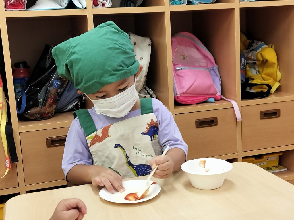 今までは簡単なお手伝いはしたことがあったけれど、エプロンと三角巾をつけたクッキングは初めてで、みんなワクワクがとまりません(^-^)そら組さんは、餃子の皮を使って作りました。