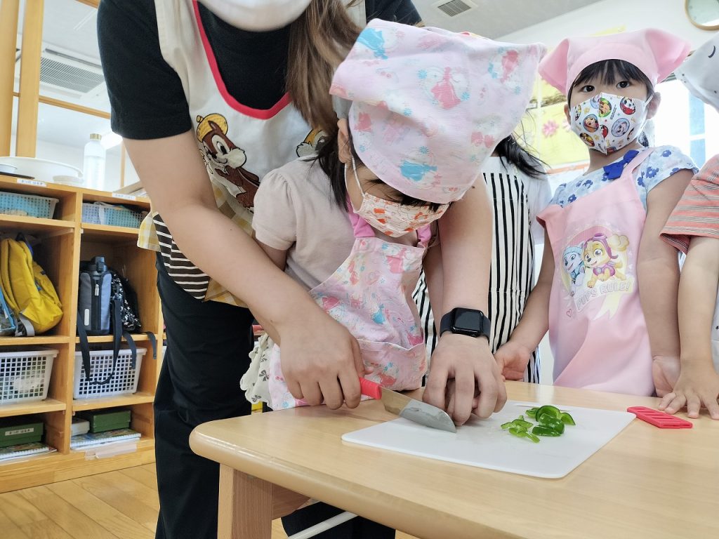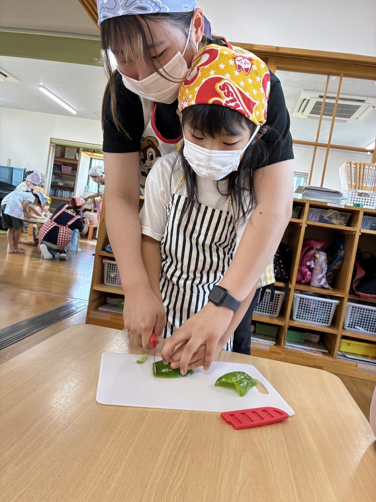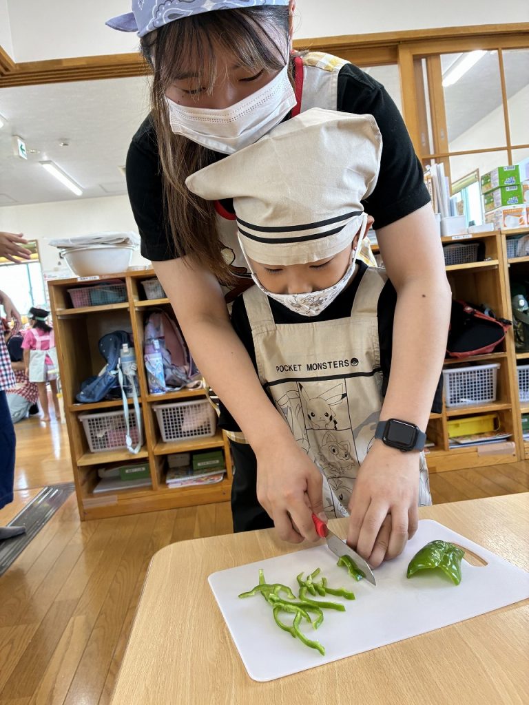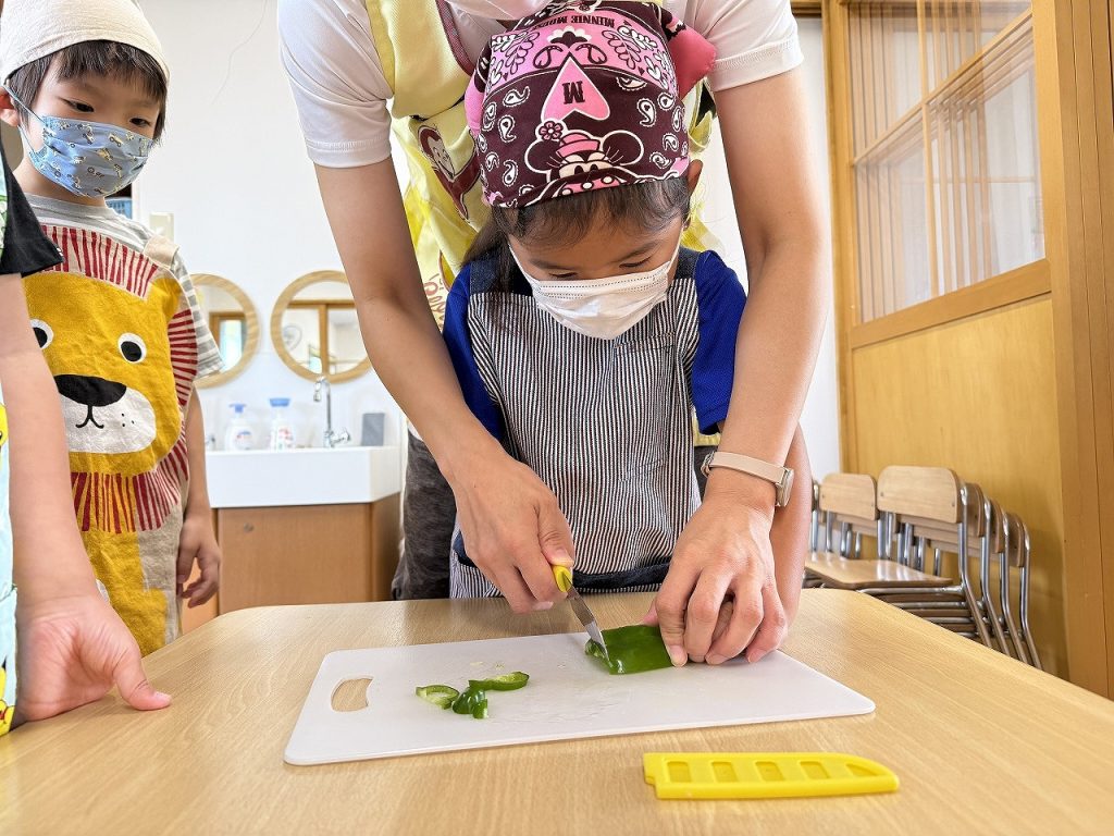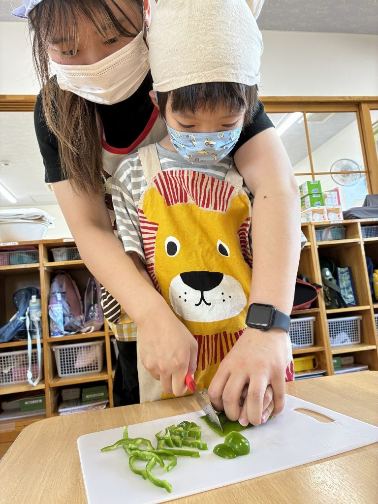 まずは、保育者に手伝ってもらいながら トッピング用のピーマンを細く切っていきました。