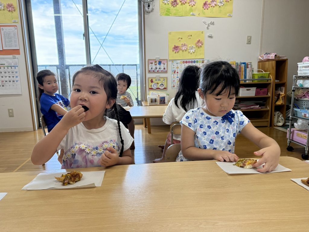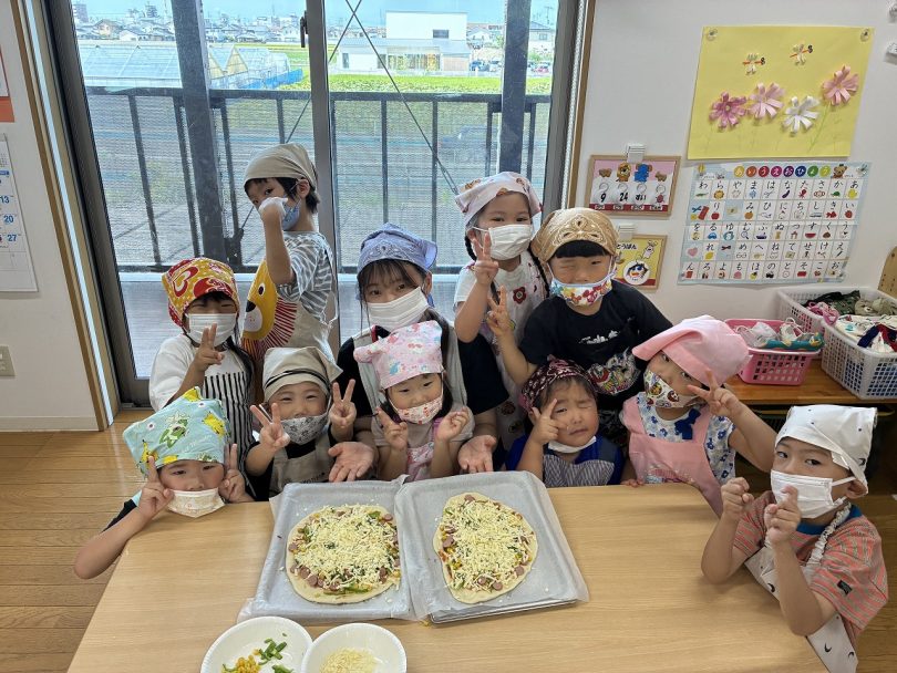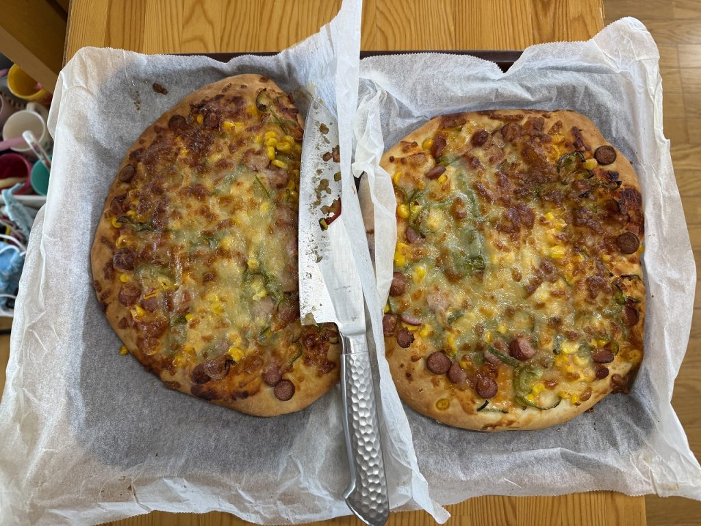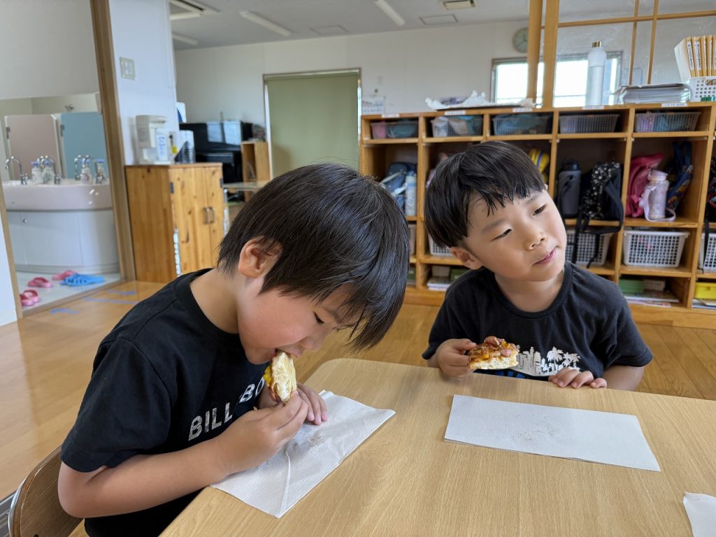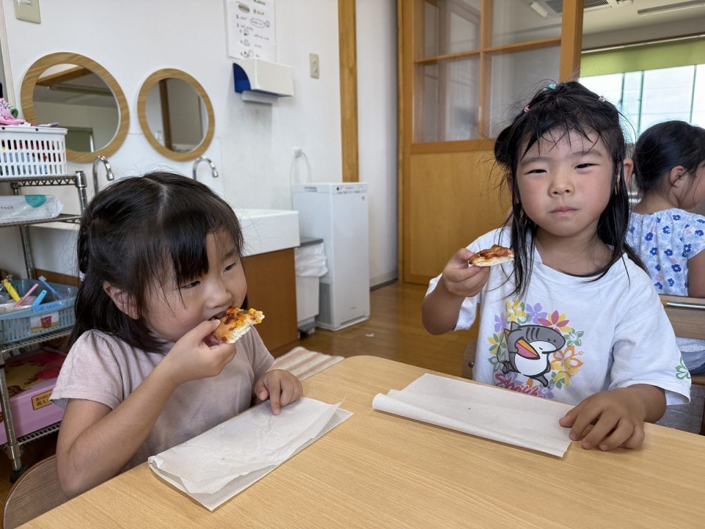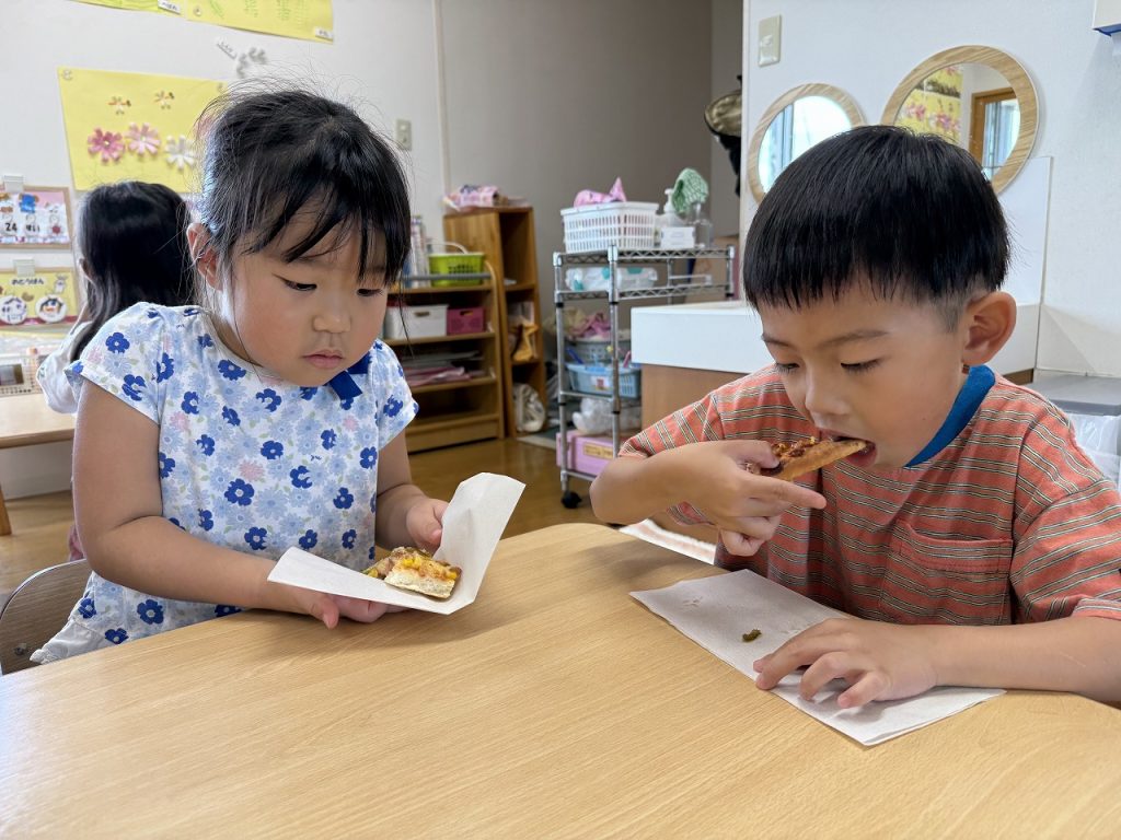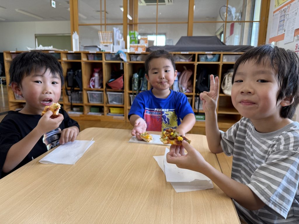 「できたよ~」の声を聞いて、元気に部屋に戻ってきた子どもたち。みんなで作ったピザは格別でした(^^)v