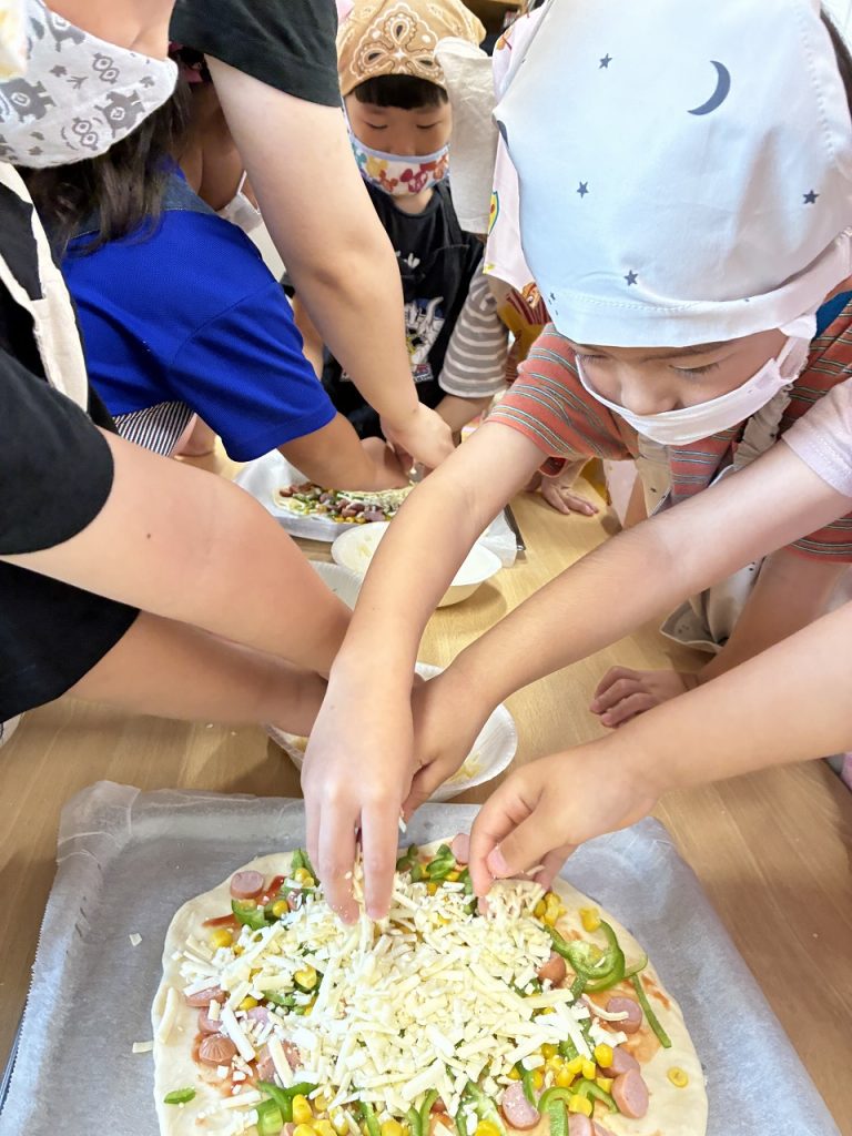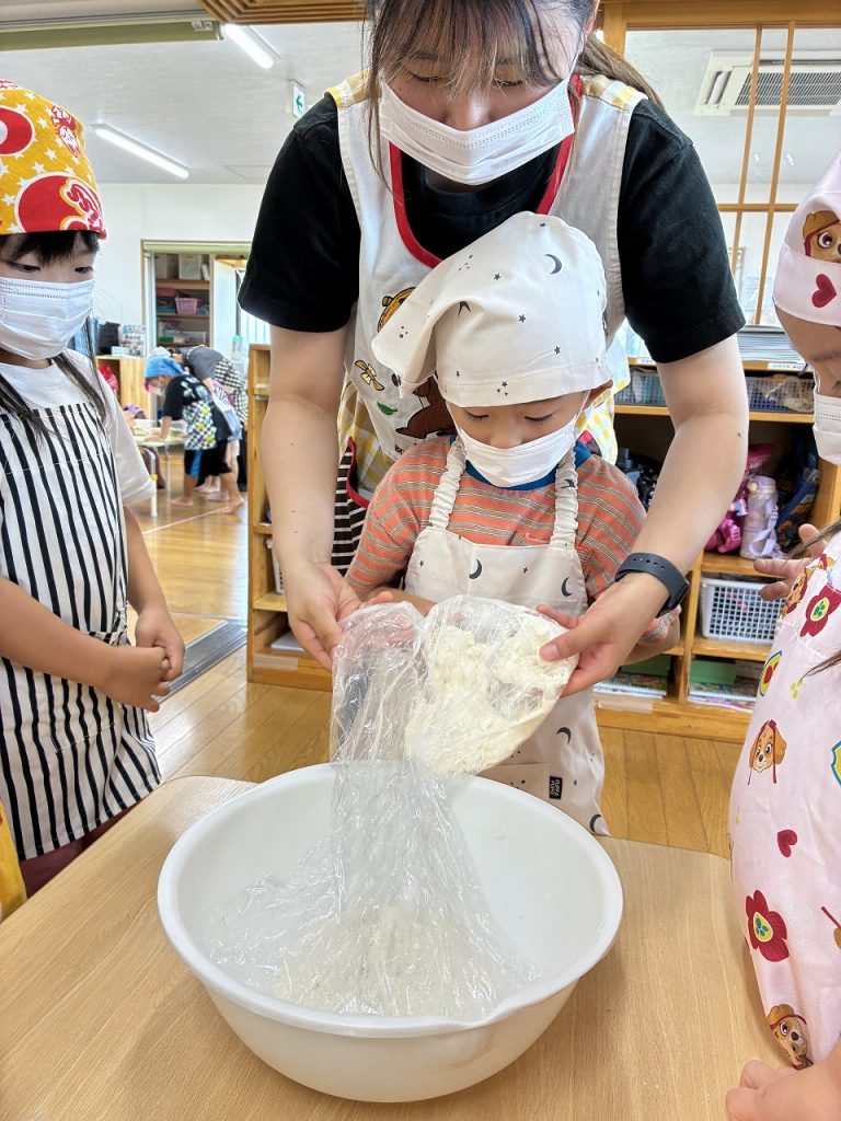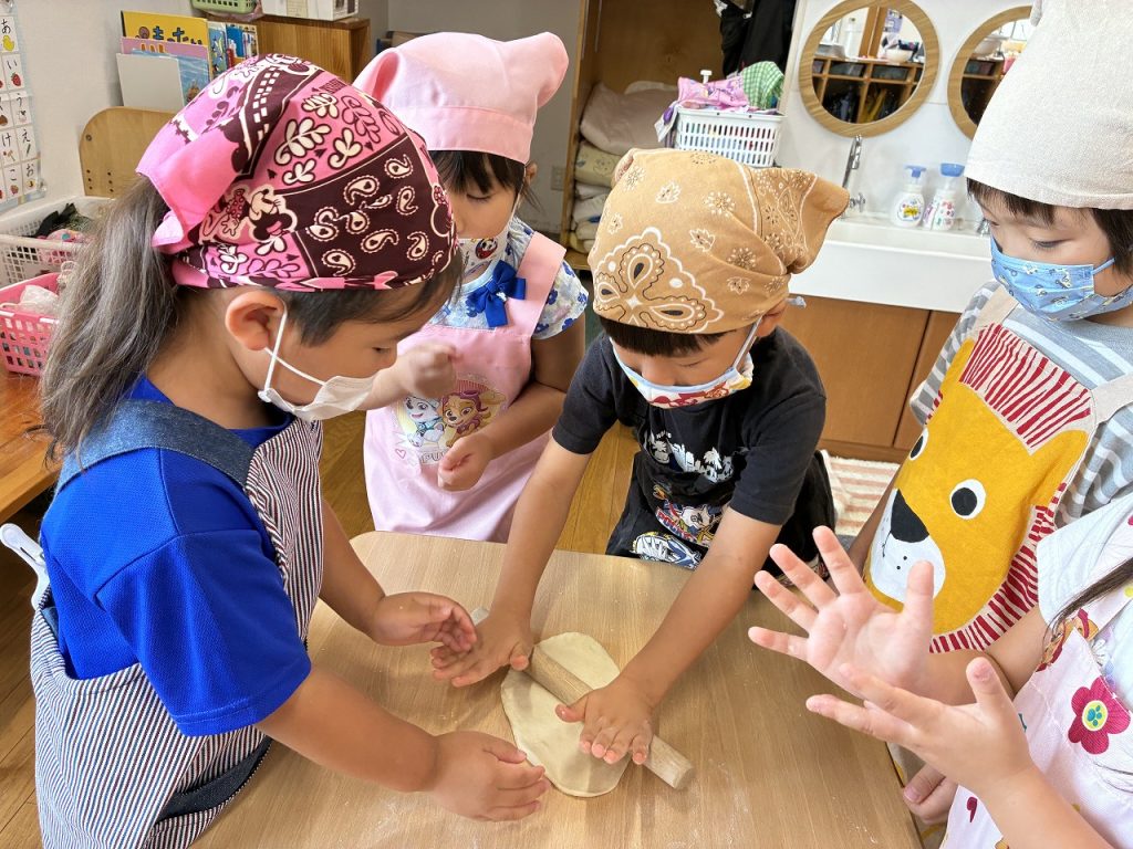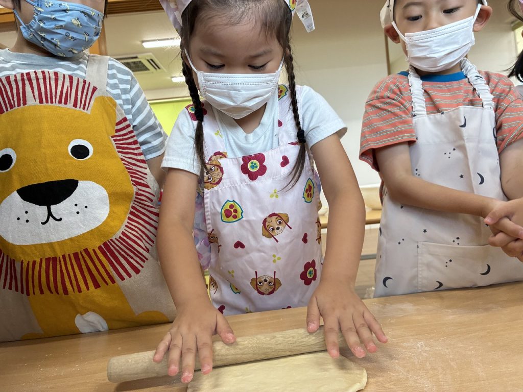 今回は、生地作りにも挑戦!!材料を混ぜて、こねて、伸ばして…みんなで協力して生地を仕上げていきました。
