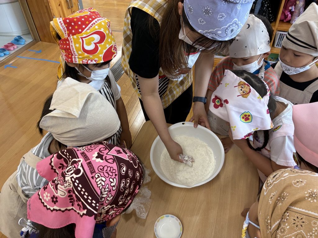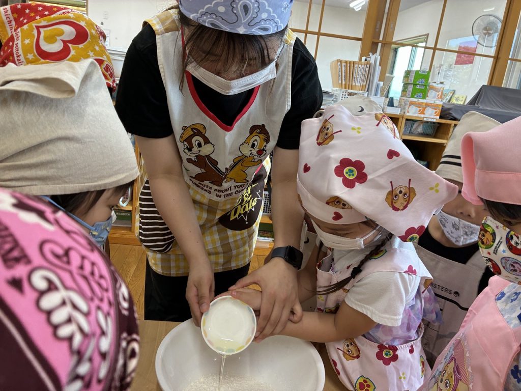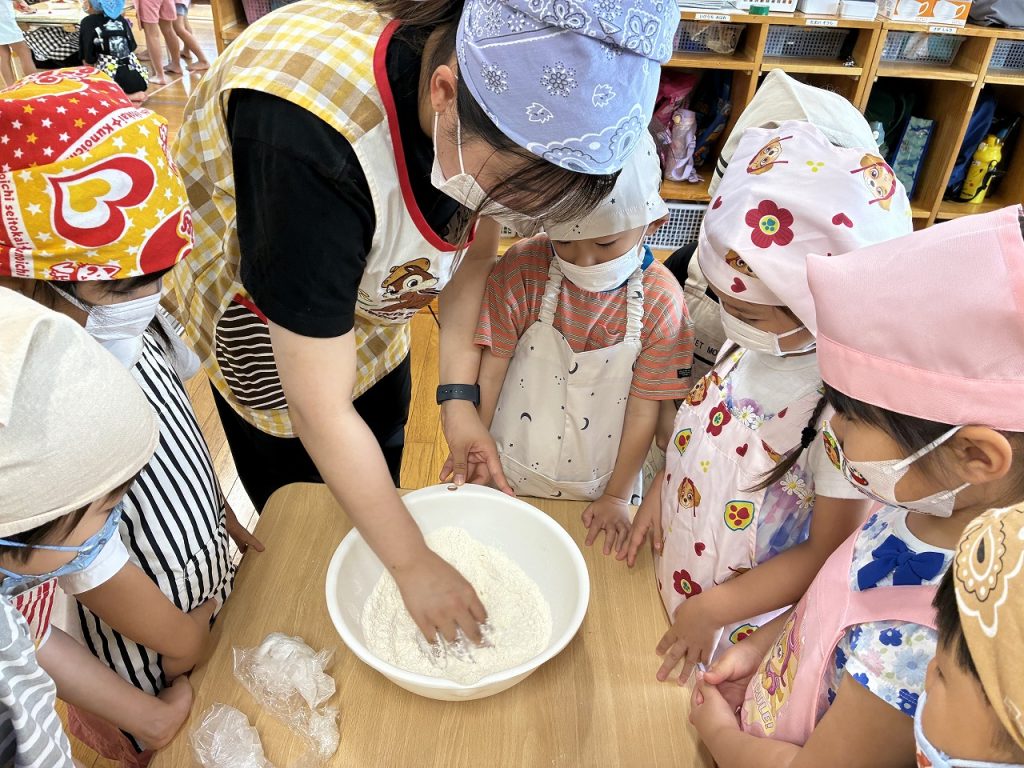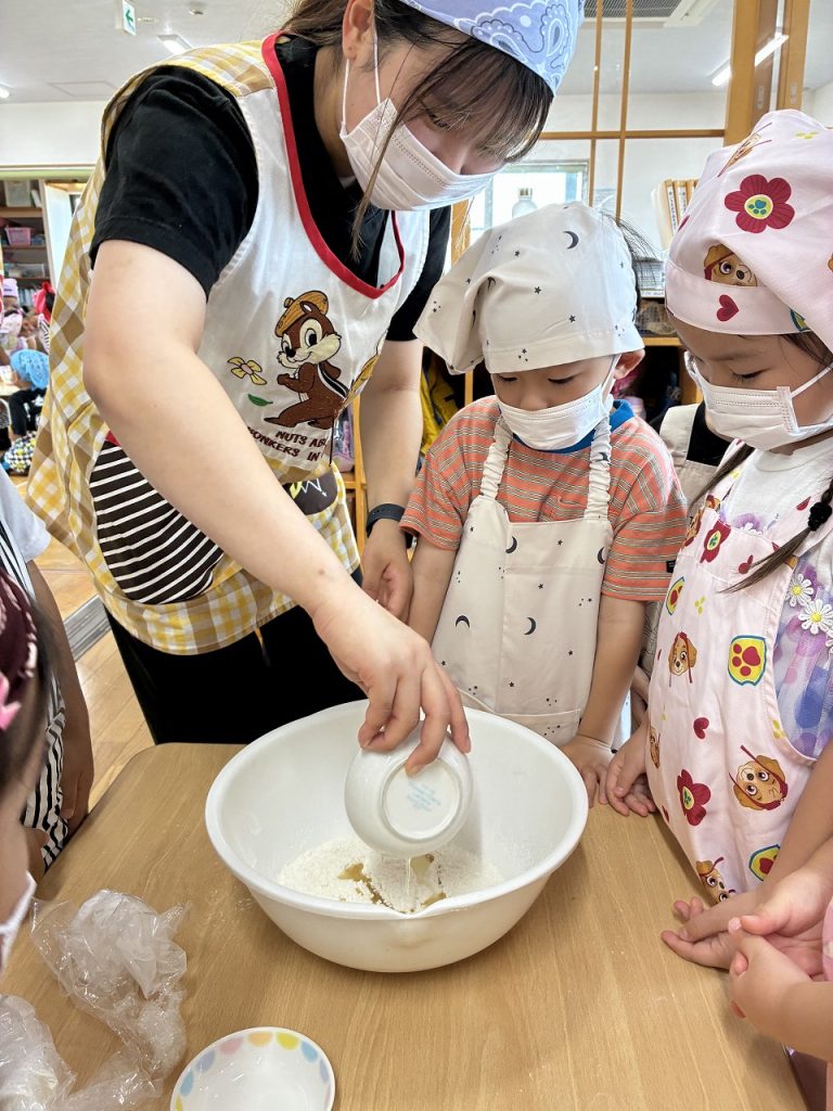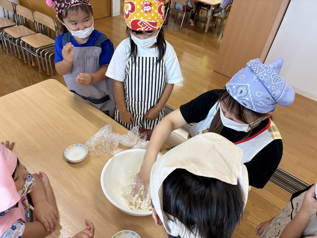 今回は、生地作りにも挑戦!!材料を混ぜて、こねて、伸ばして…みんなで協力して生地を仕上げていきました。