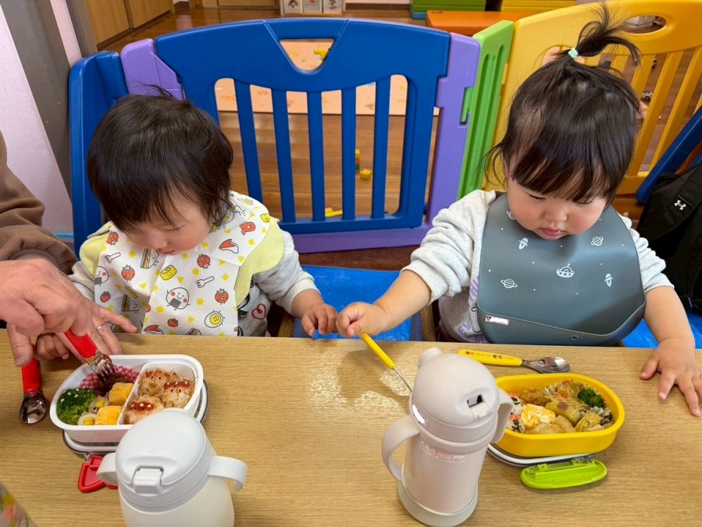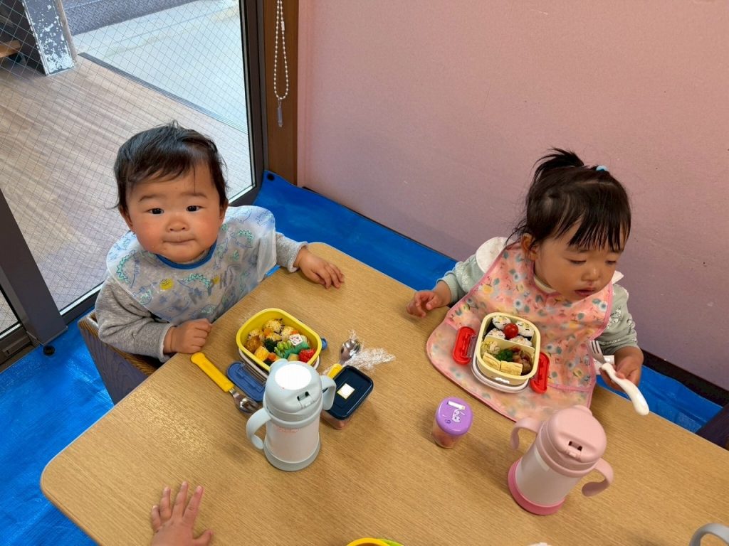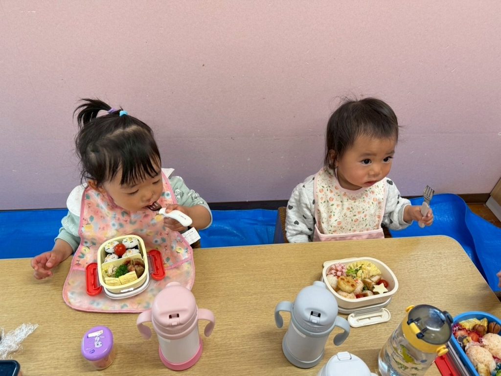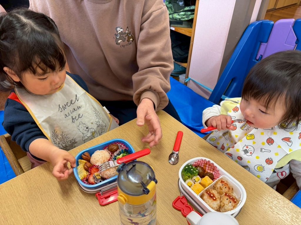 天候が良ければ園庭でお弁当を食べる予定でしたが、この日は風が冷たかったので室内で食べました。お弁当の準備をしていただき、ありがとうございました。